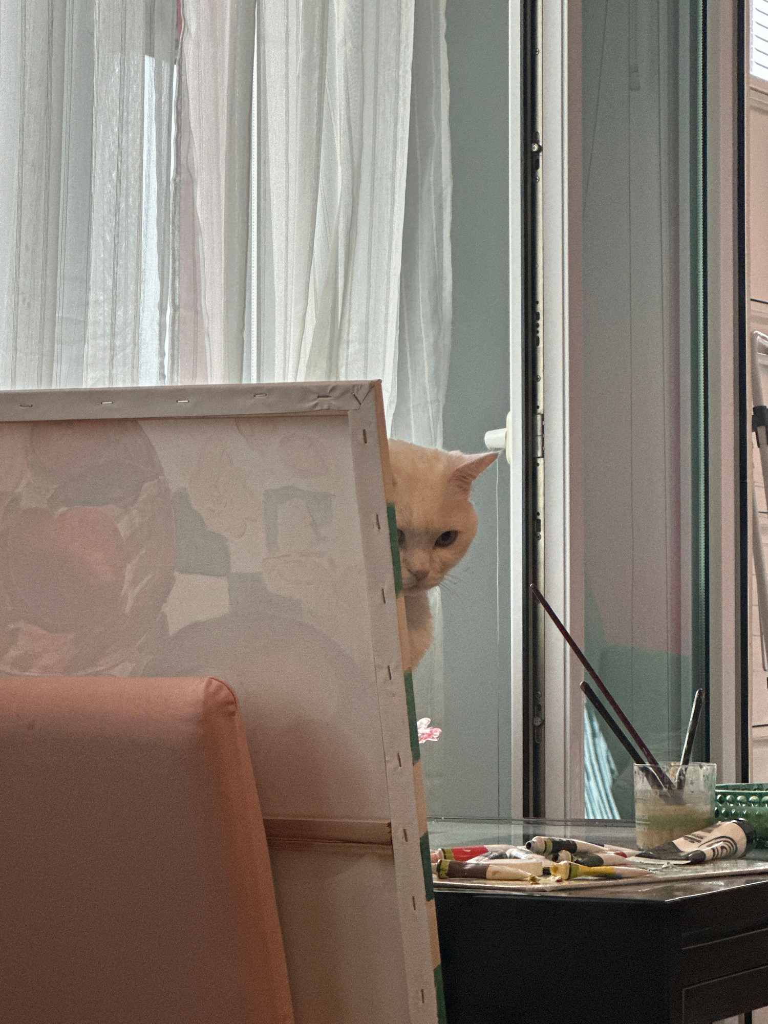 A light-colored cat peeks from behind a framed canvas against the backdrop of a window with closed blinds. The location is unknown, but the lack of specific landmarks or architectural details obscures…read more