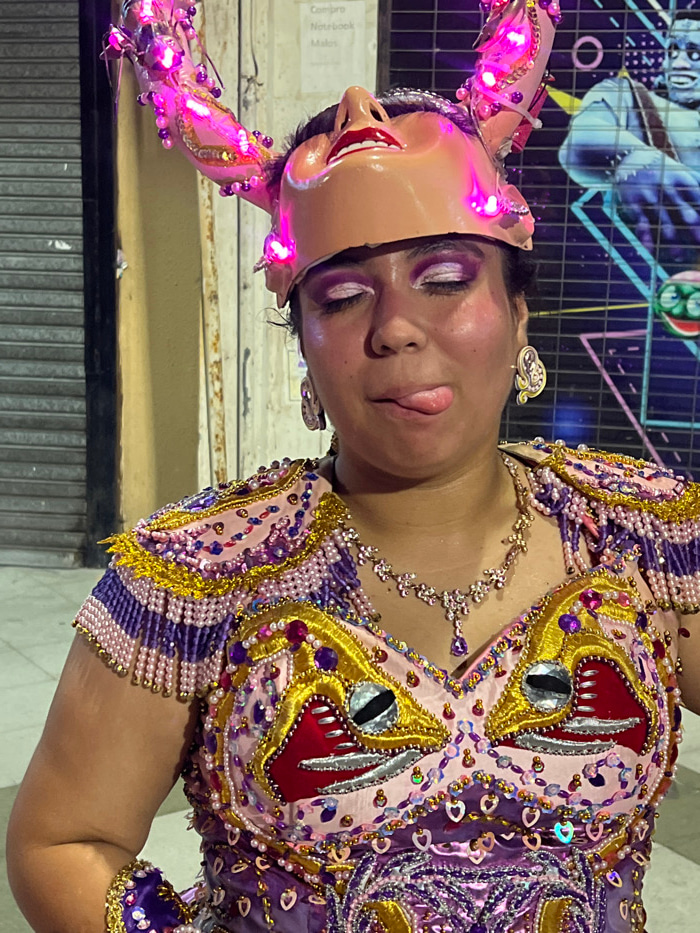 The image depicts an adult female in an elaborate costume, posing in an urban environment at night, identified as a location in Arica, Chile. The subject faces the viewer directly, with her eyes close…read more