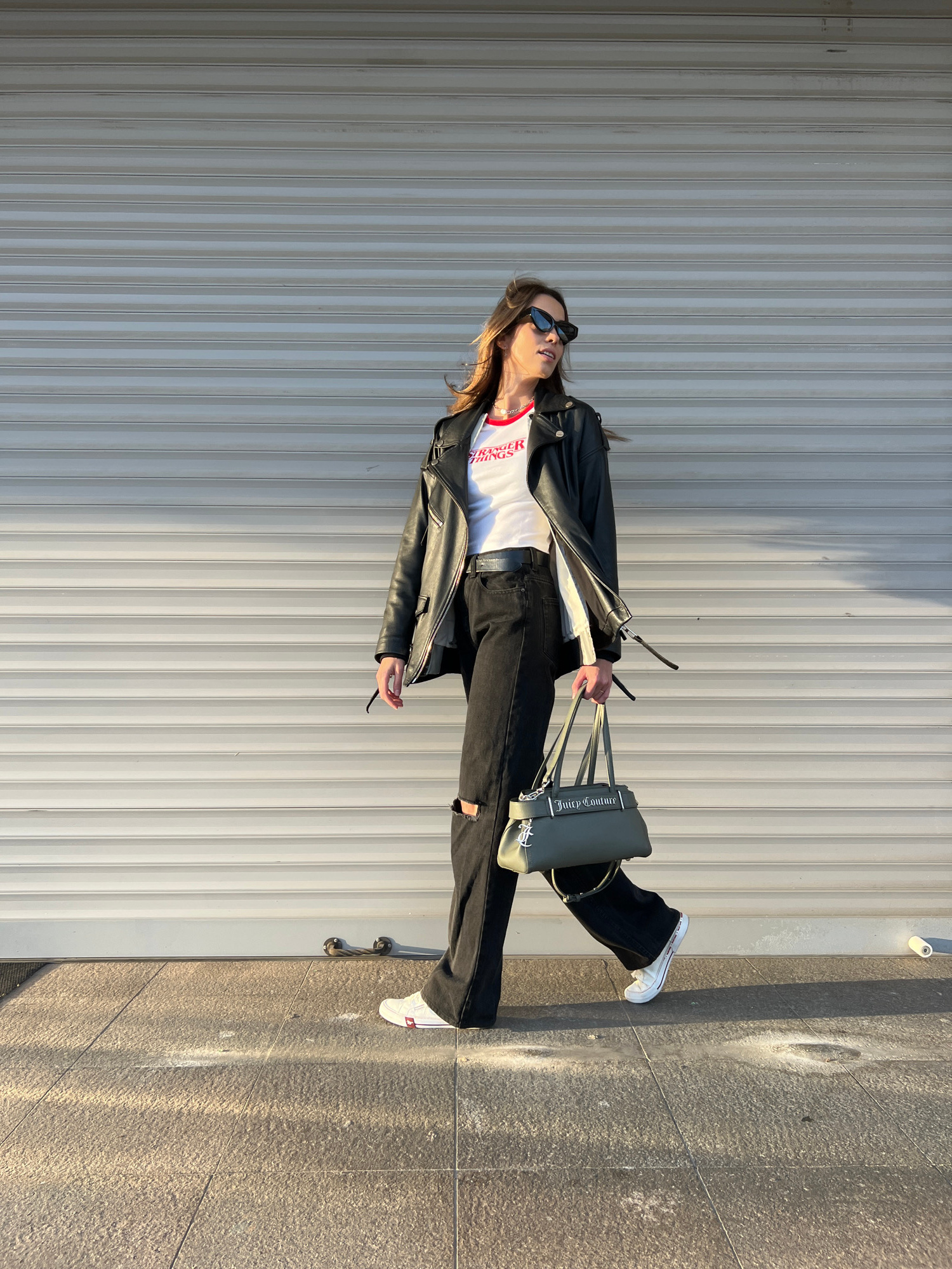 A young woman stands on a grey sidewalk next to a grey roll-up door in an outdoor setting, likely in Bar, Montenegro, based on the request. She wears black denim jeans with a rip at the knee, a white…read more