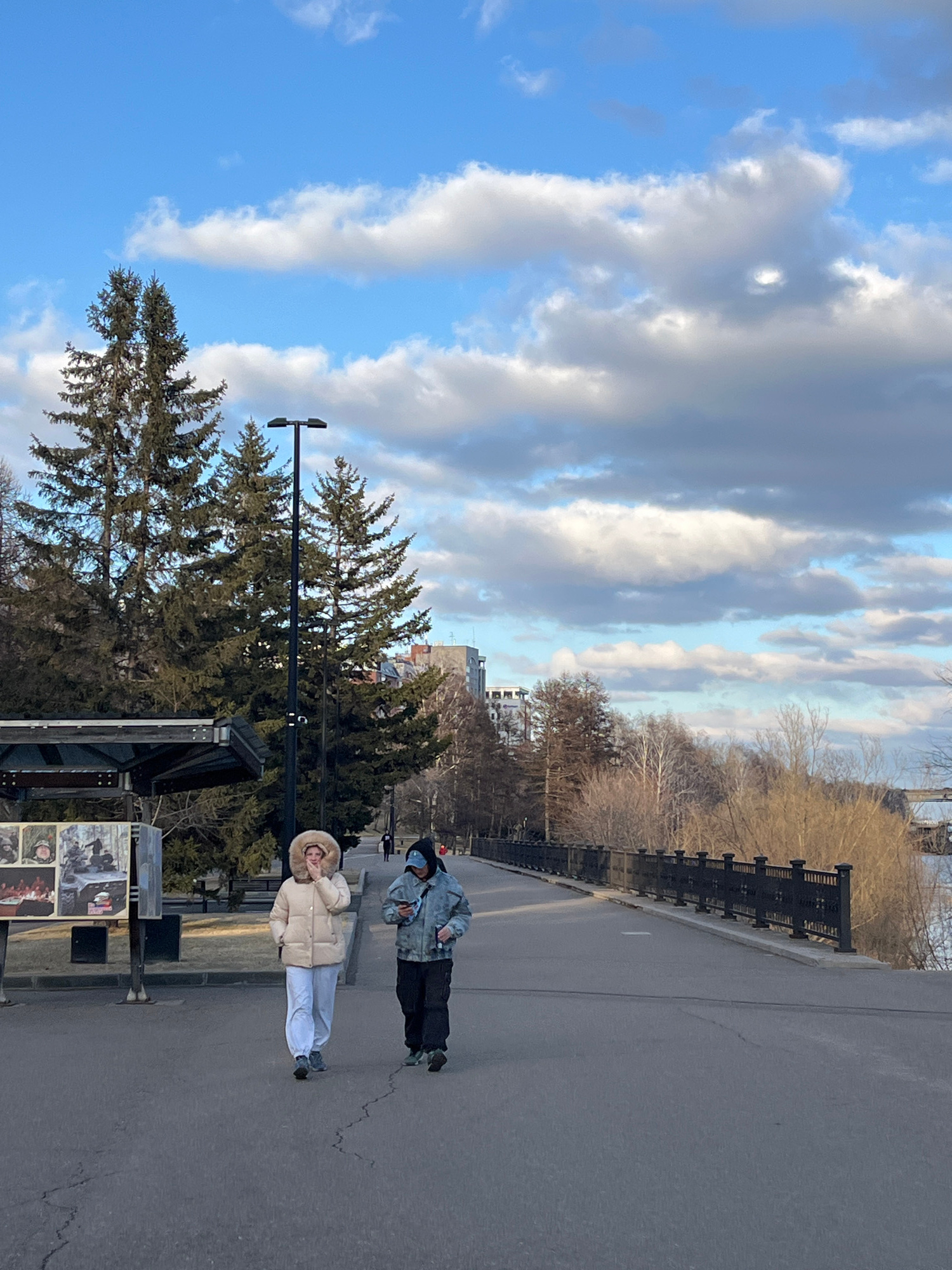The image captures an outdoor scene in what appears to be an urban park or embankment in Krasnoyarsk, Russia. Two individuals are standing on a paved path or road. The person closer to the foreground…read more