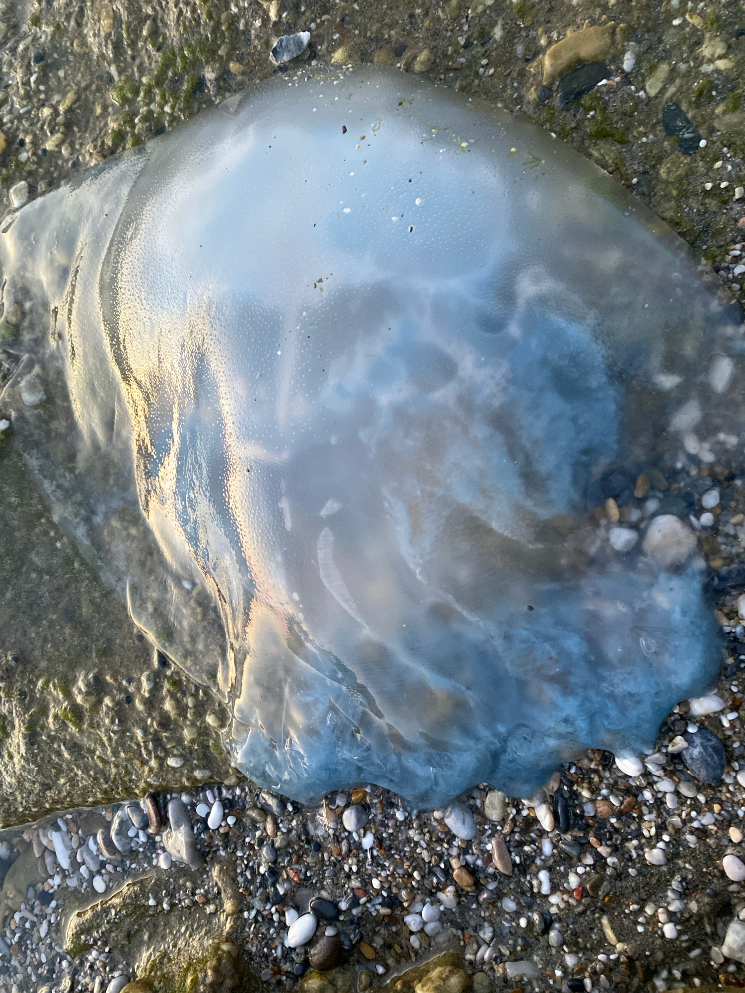 A jellyfish lies on a beach, surrounded by pebbles, sand, and algae. The jellyfish is translucent, with a blue tint near the top, and reflects the sky and sand. The scene depicts a beached marine anim…read more