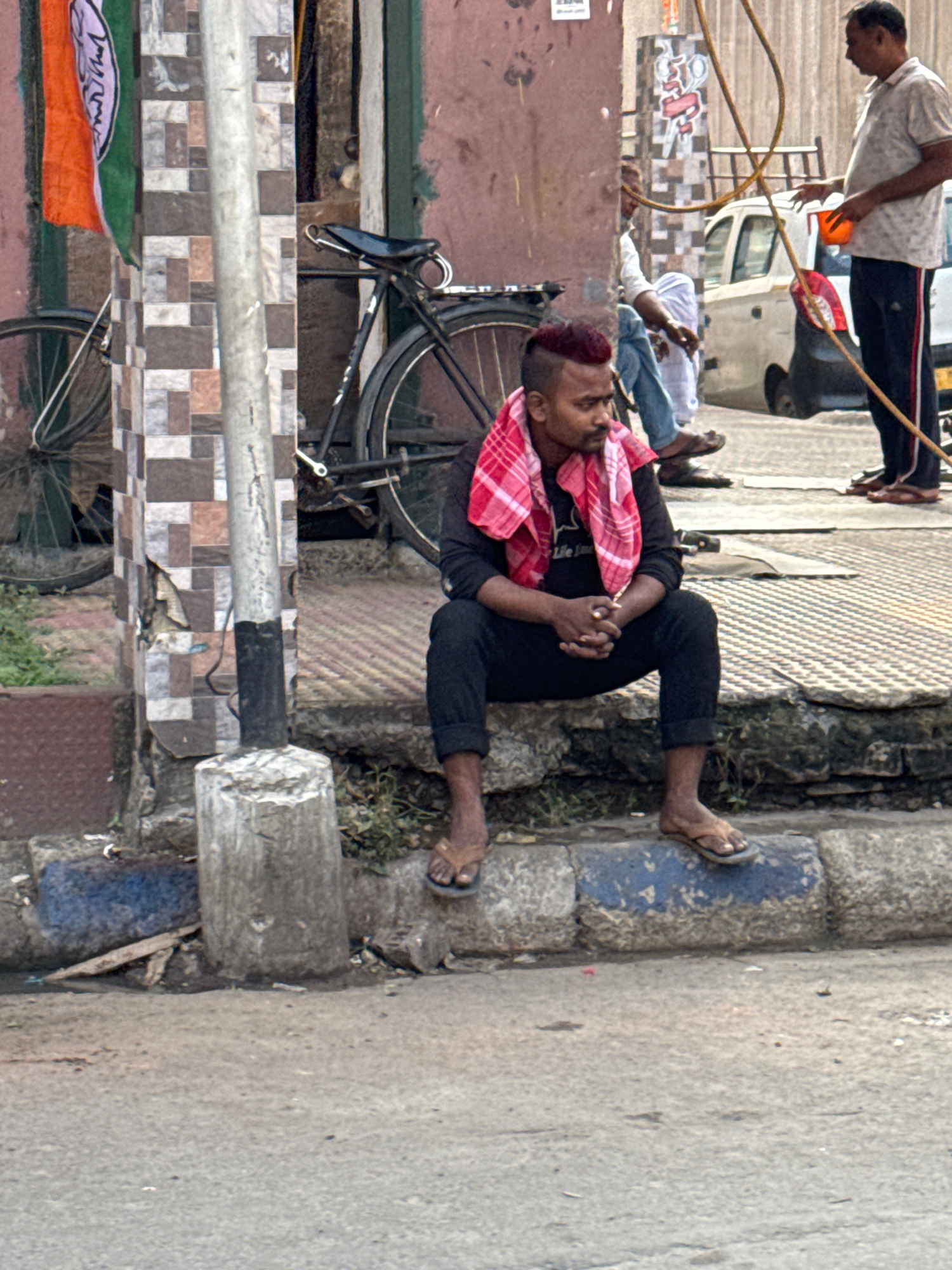 A man with a red-dyed mohawk is lying down on the side of a street in Kolkata, India, wearing black clothing and sandals. He is using a red and white checkered cloth as a pillow, his hands clasped. A…read more