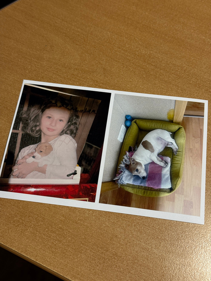 A rectangular photographic print, depicting two distinct images side-by-side, lies diagonally on a light brown wooden surface. The overall scene is located in Kyiv, Ukraine. The left image shows a yo…read more