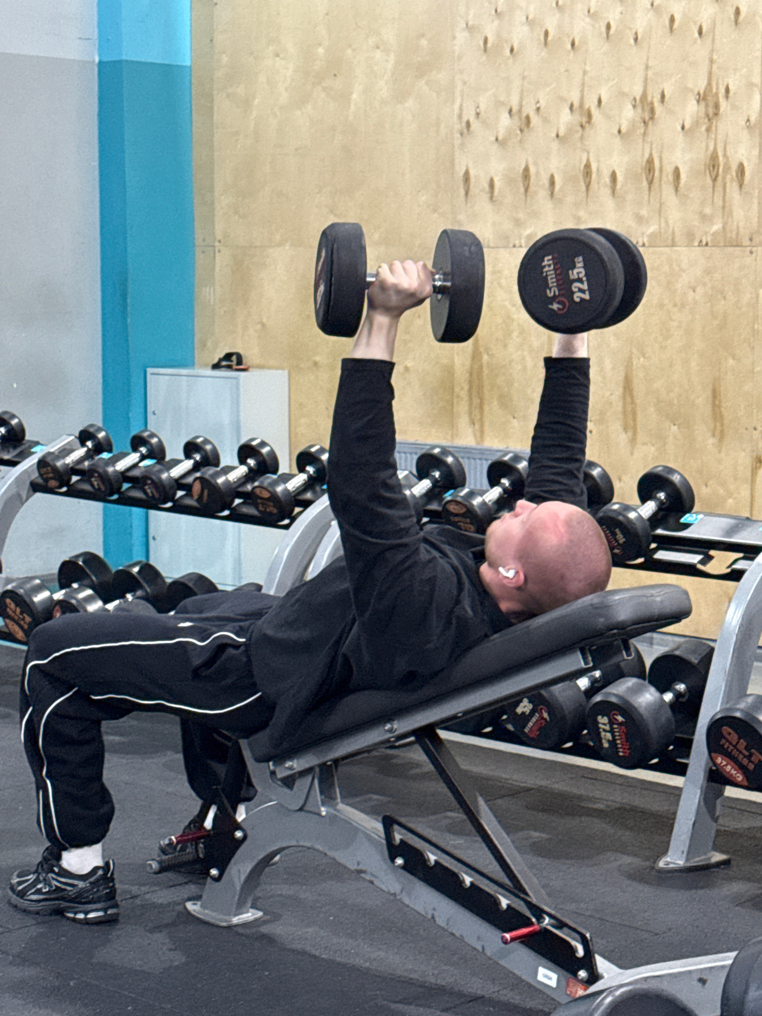 A man is exercising with dumbbells in a gym. He is positioned next to a weight rack with various dumbbells. He's wearing a black long-sleeved shirt and black sweatpants with a white stripe. He has whi…read more