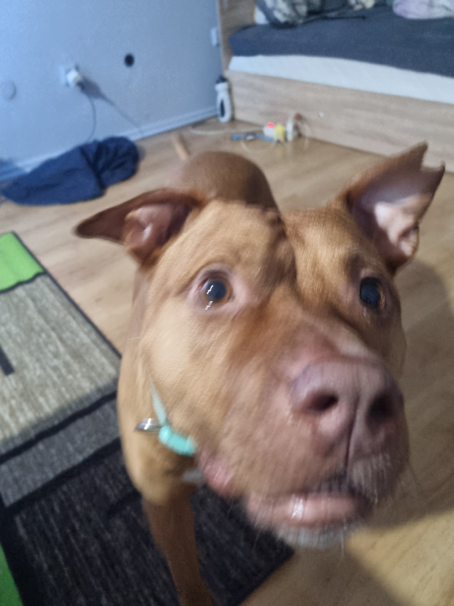 A close-up, high-angle shot reveals a light brown dog with floppy ears, a large nose, and a light blue collar with a silver tag. The dog's face is prominent in the foreground, with its eyes looking up…read more