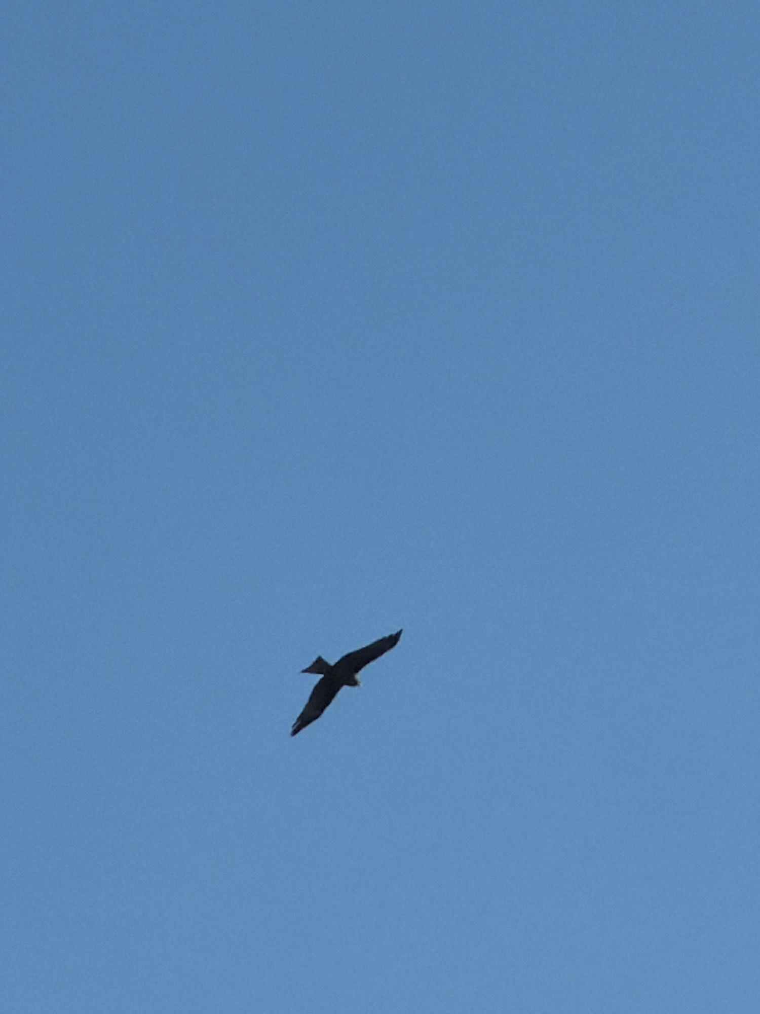 A single bird is in flight against a clear blue sky. The location in Chaikovsky, Russia, is not evident from the image.