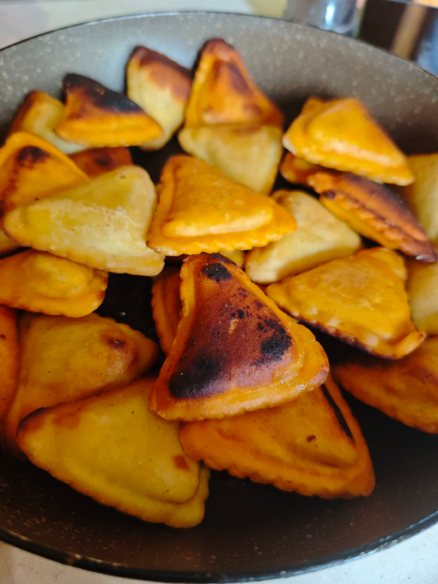 The image depicts a collection of triangular-shaped pastries, likely pierogi or similar dumplings, contained within a dark-colored frying pan. The pastries are golden-yellow to orange in color, with s…read more