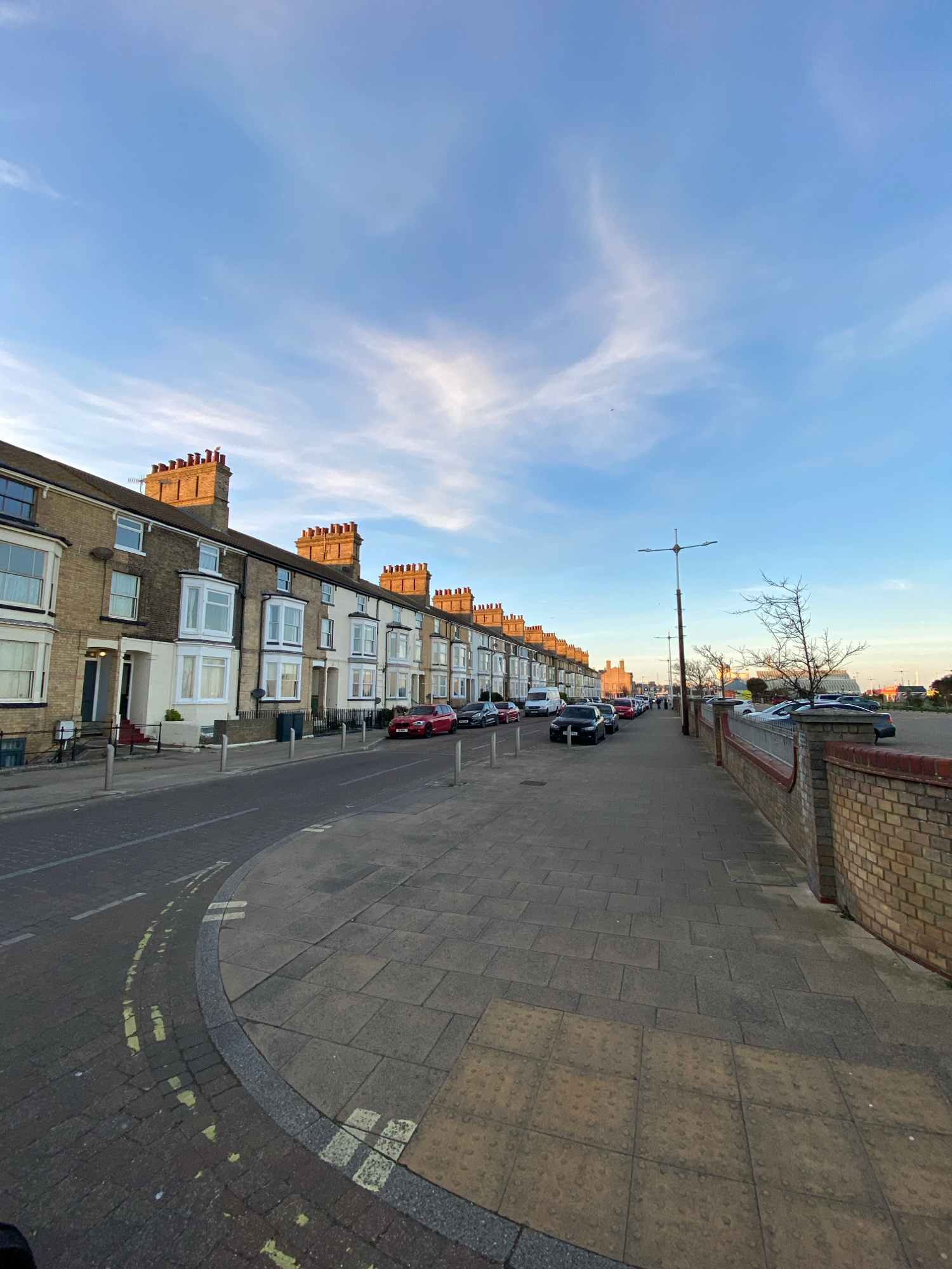 An eye-level, outdoor shot, taken in the town of Felixstowe, in East Suffolk, United Kingdom, displays a residential street. The image is taken from the sidewalk, where the ground is composed of squar…read more