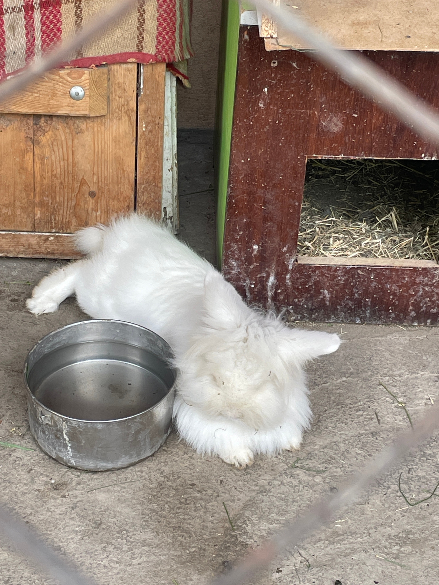 A fluffy white rabbit is resting next to a metal bowl on a concrete surface. The rabbit's head is resting on the edge of the bowl. The rabbit is near a wooden structure, possibly a hutch or enclosure,…read more