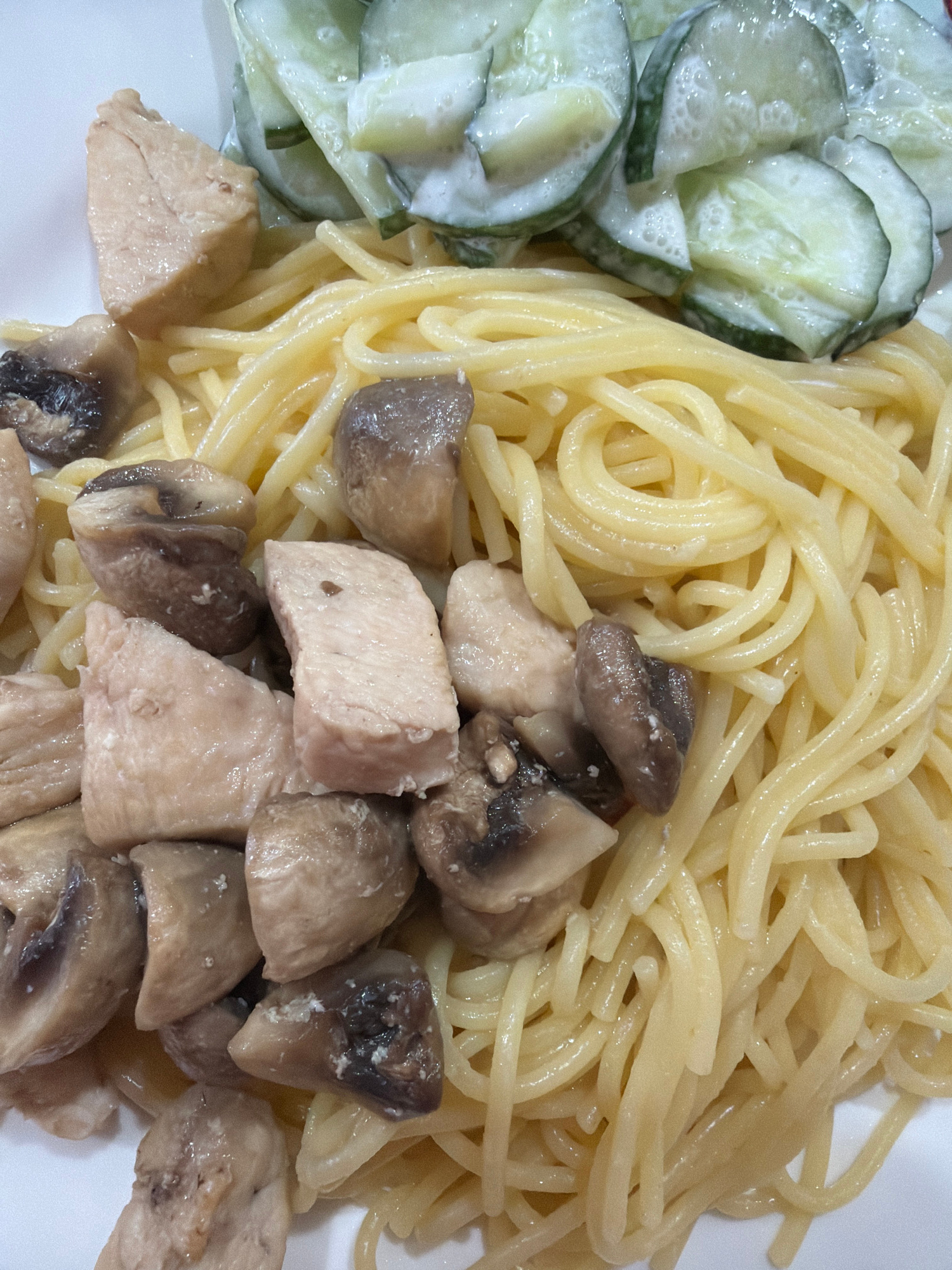 A plate of food is presented in a close-up shot. The plate is filled with spaghetti, cooked chicken pieces, and mushrooms. Beside the spaghetti is a serving of sliced cucumbers with a creamy sauce. Thβ¦read more