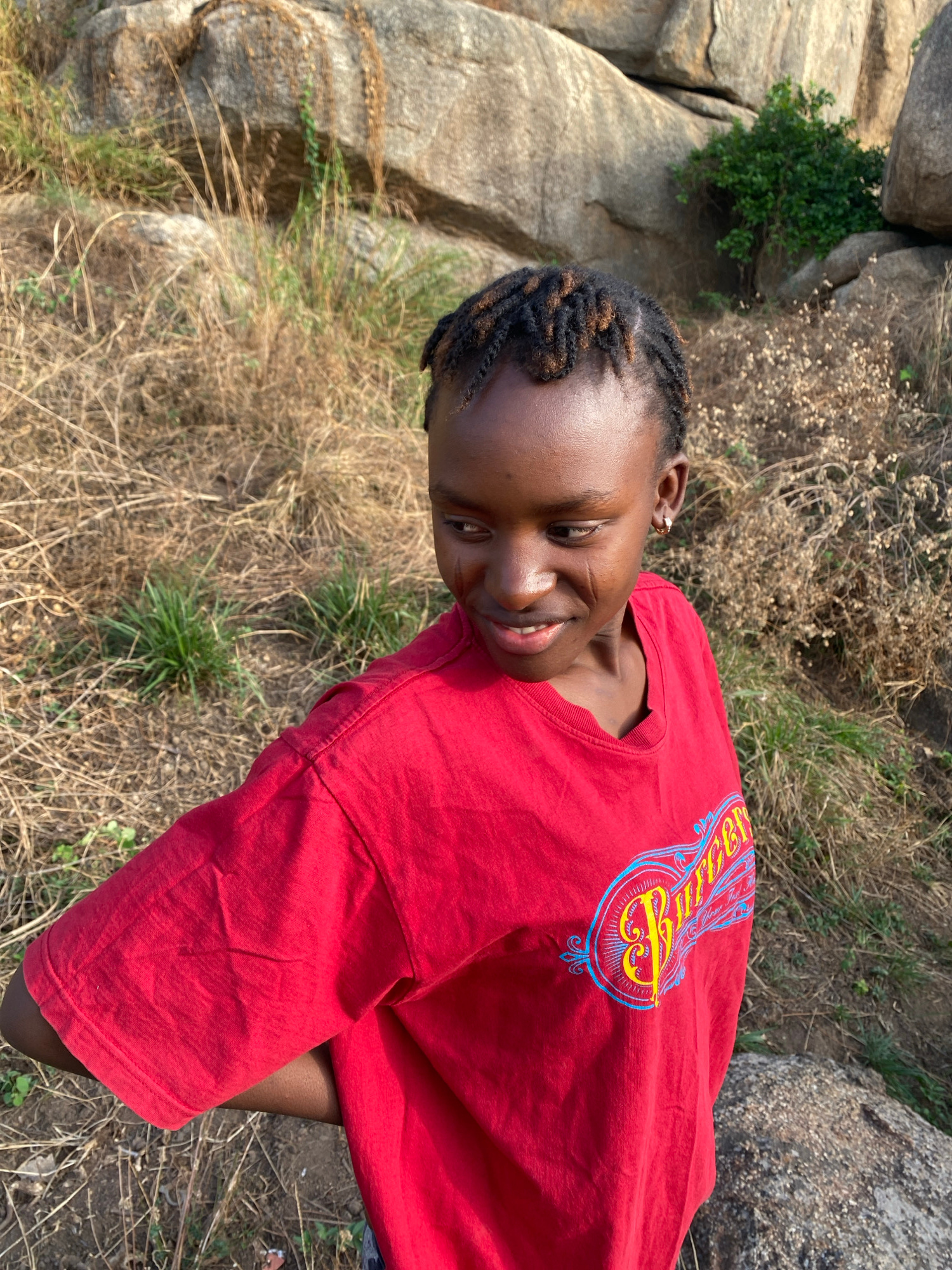 A young, dark-skinned woman with braided hair is smiling. She is wearing a red t-shirt with a graphic design on the upper back. The background indicates an outdoor location in a rural or semi-rural ar…read more