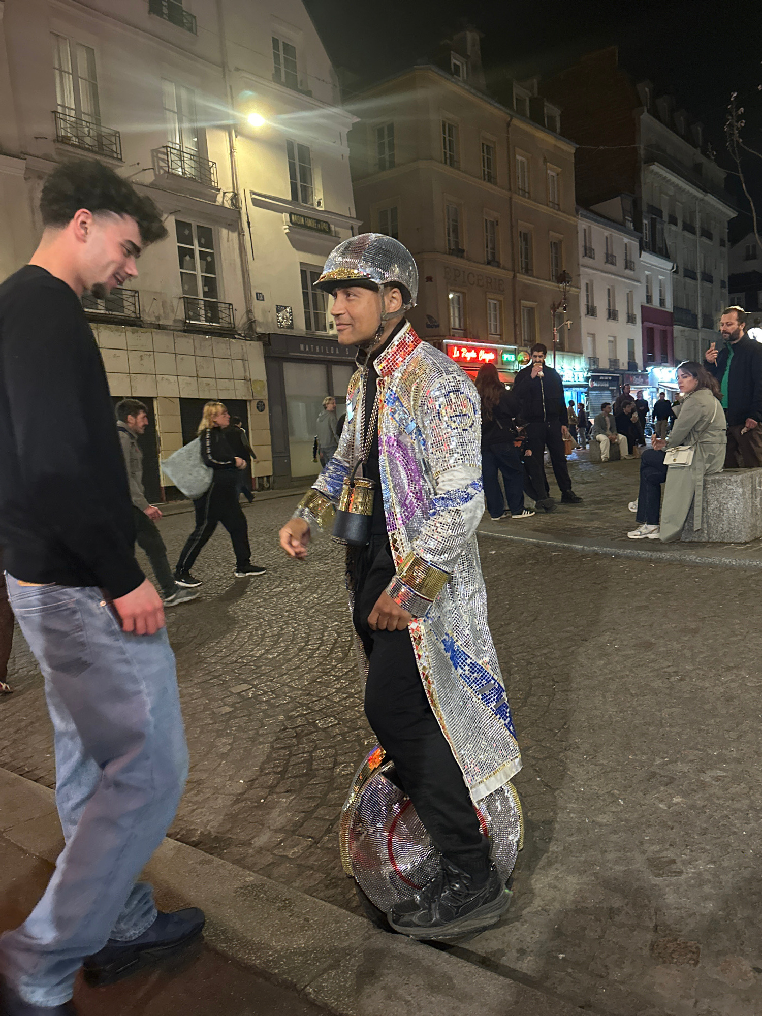 A night-time street scene in Paris, France, features a man dressed in a disco-ball suit and helmet. He stands on a large disco ball. The buildings are light-colored with multiple windows. Several peop…read more