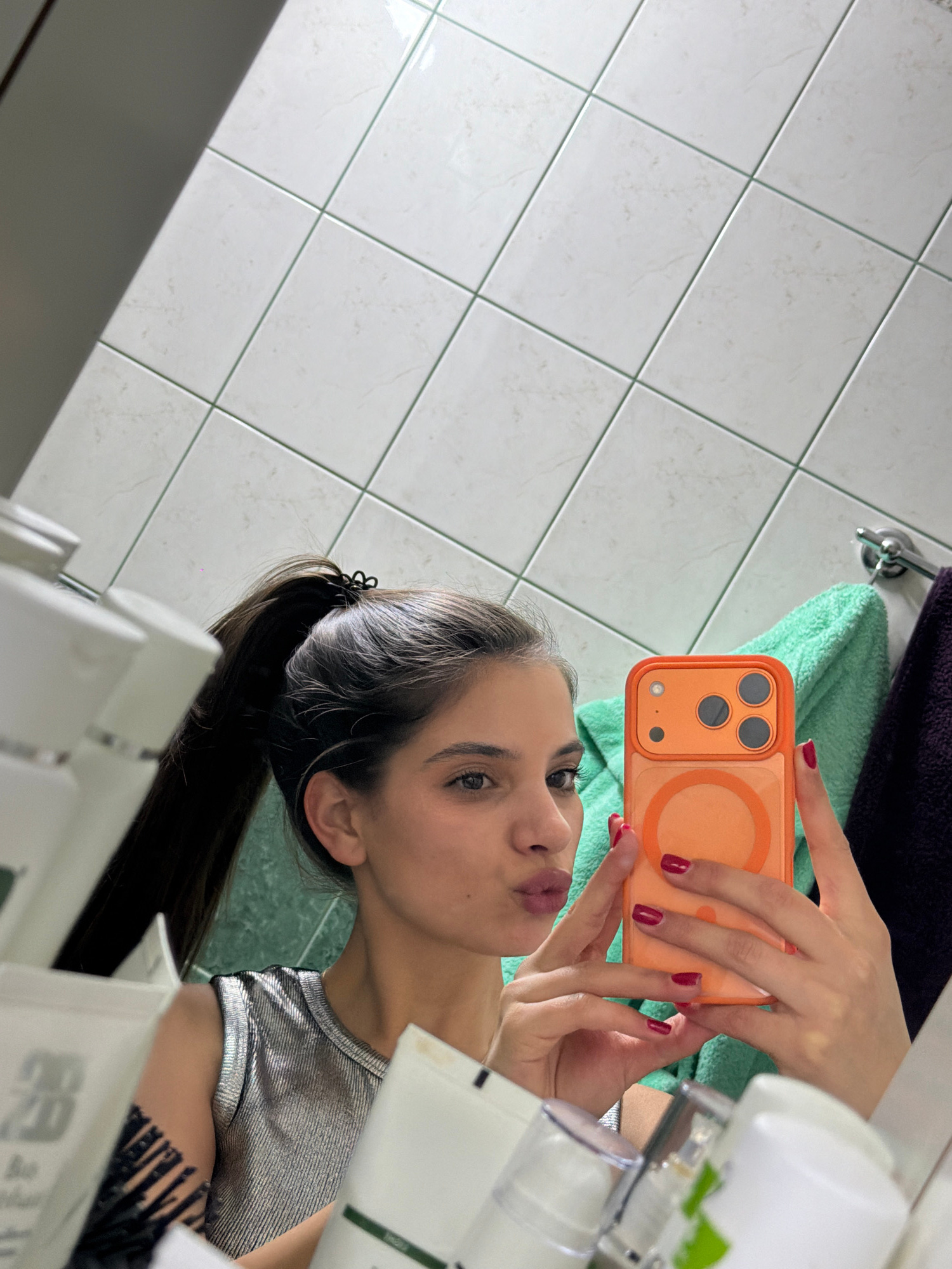 A young woman is taking a selfie in a bathroom with white tiled walls. She is holding an orange iPhone with a MagSafe case. The reflection shows her wearing a silver top with black accents. Her hair i…read more