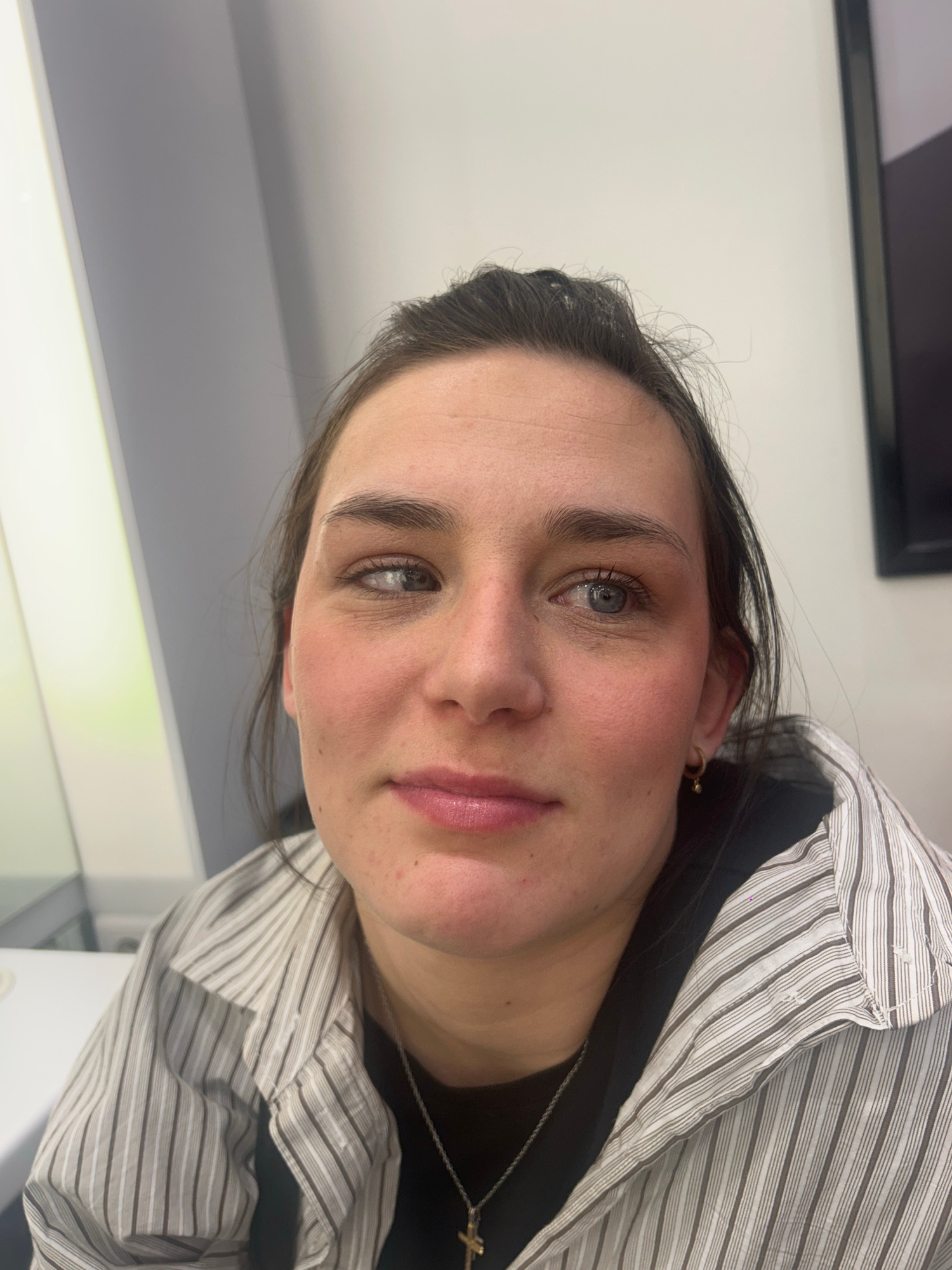 A close-up shot depicts a fair-skinned young woman indoors. She has dark hair, blue eyes, and pink lips. She wears a striped shirt over a dark top and a necklace with a cross pendant. The background f…read more