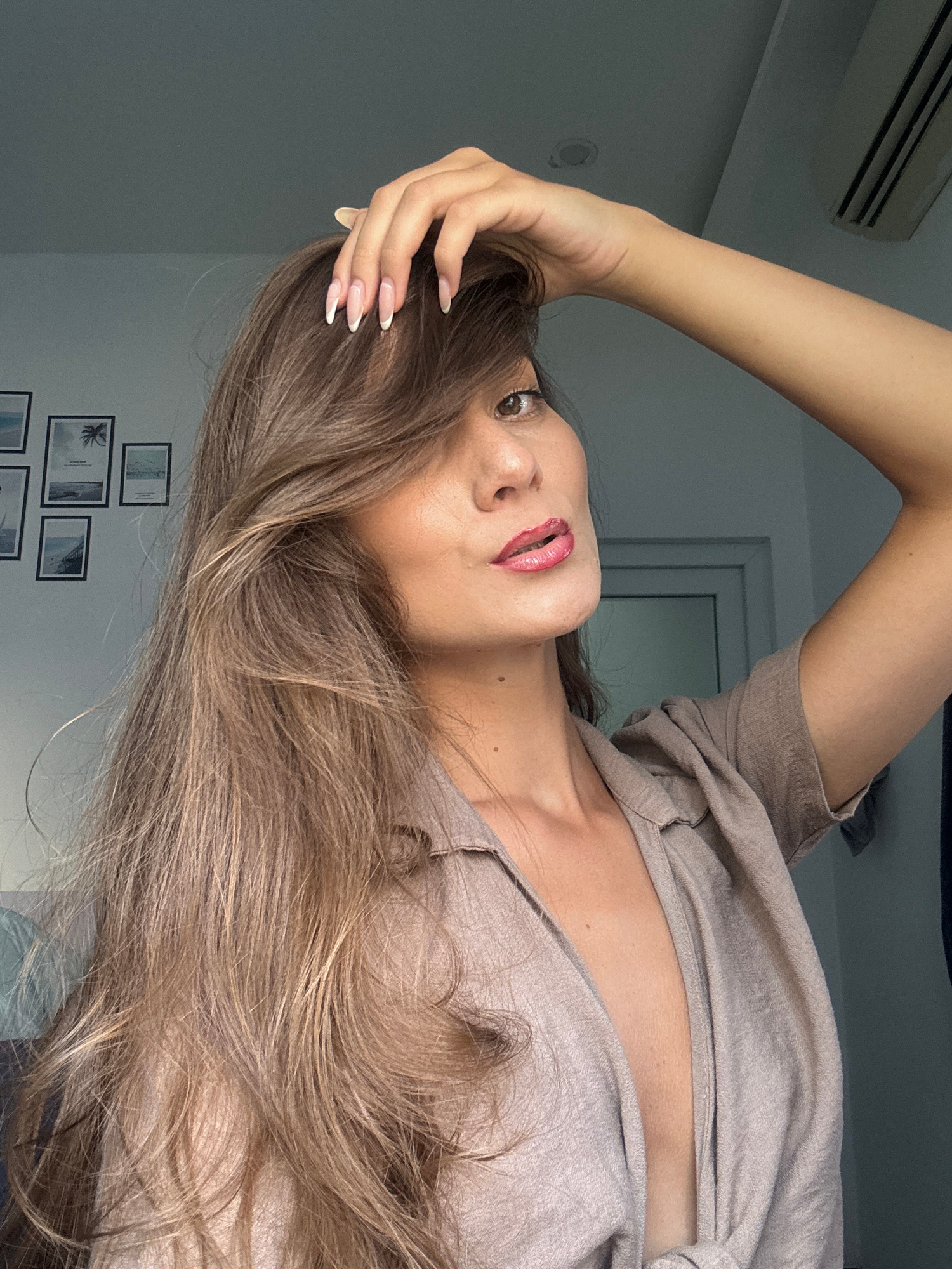A woman with long brown hair is seen in a close-up, slightly tilted composition. She wears a taupe-colored shirt and has a hand near her head. Her nails are manicured with a French tip design. The bac…read more