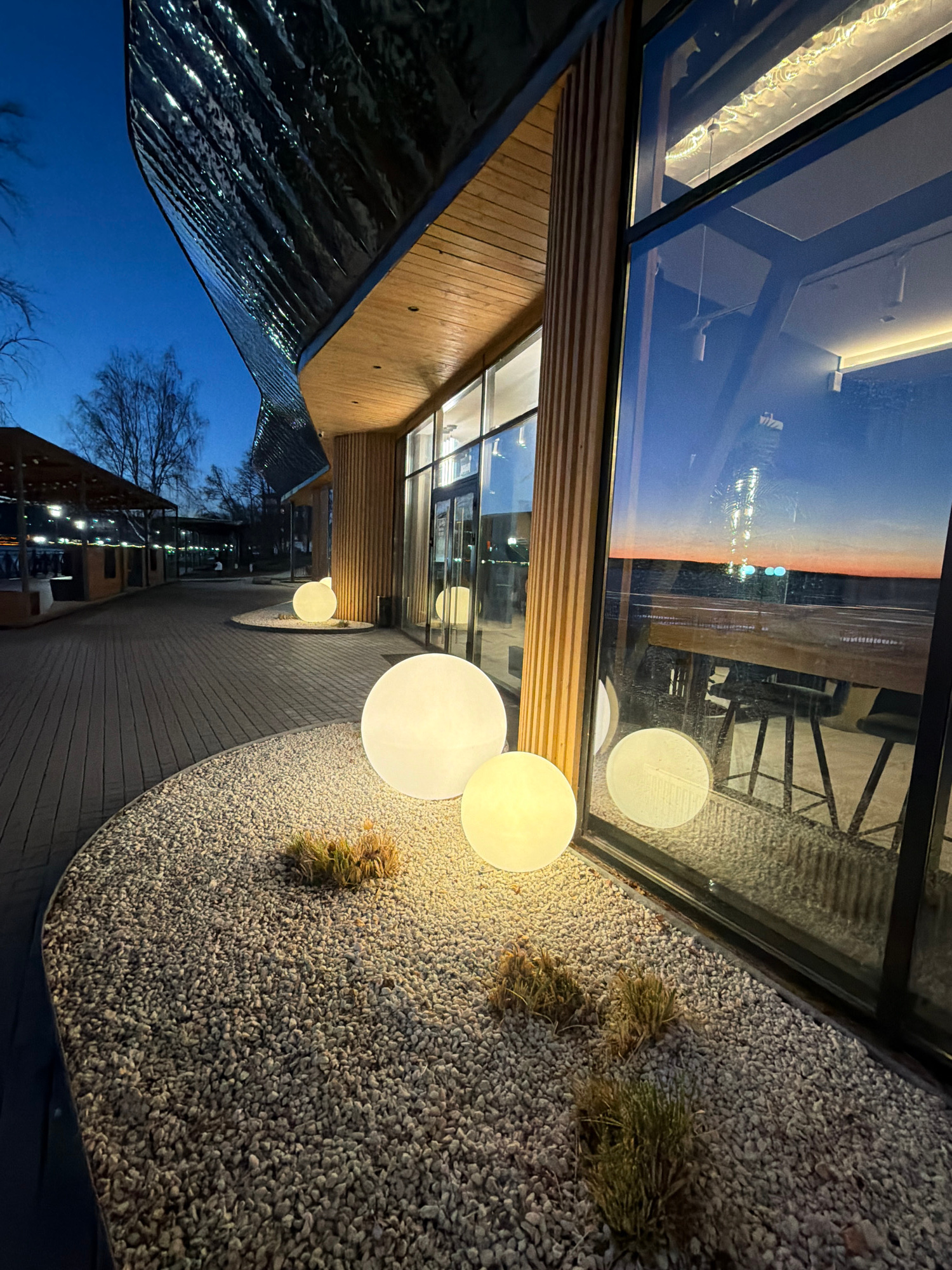 The image captures an architectural scene, possibly at twilight or in the evening, featuring a modern building design with a combination of glass, wood, and dark paneling. A notable feature is the lar…read more