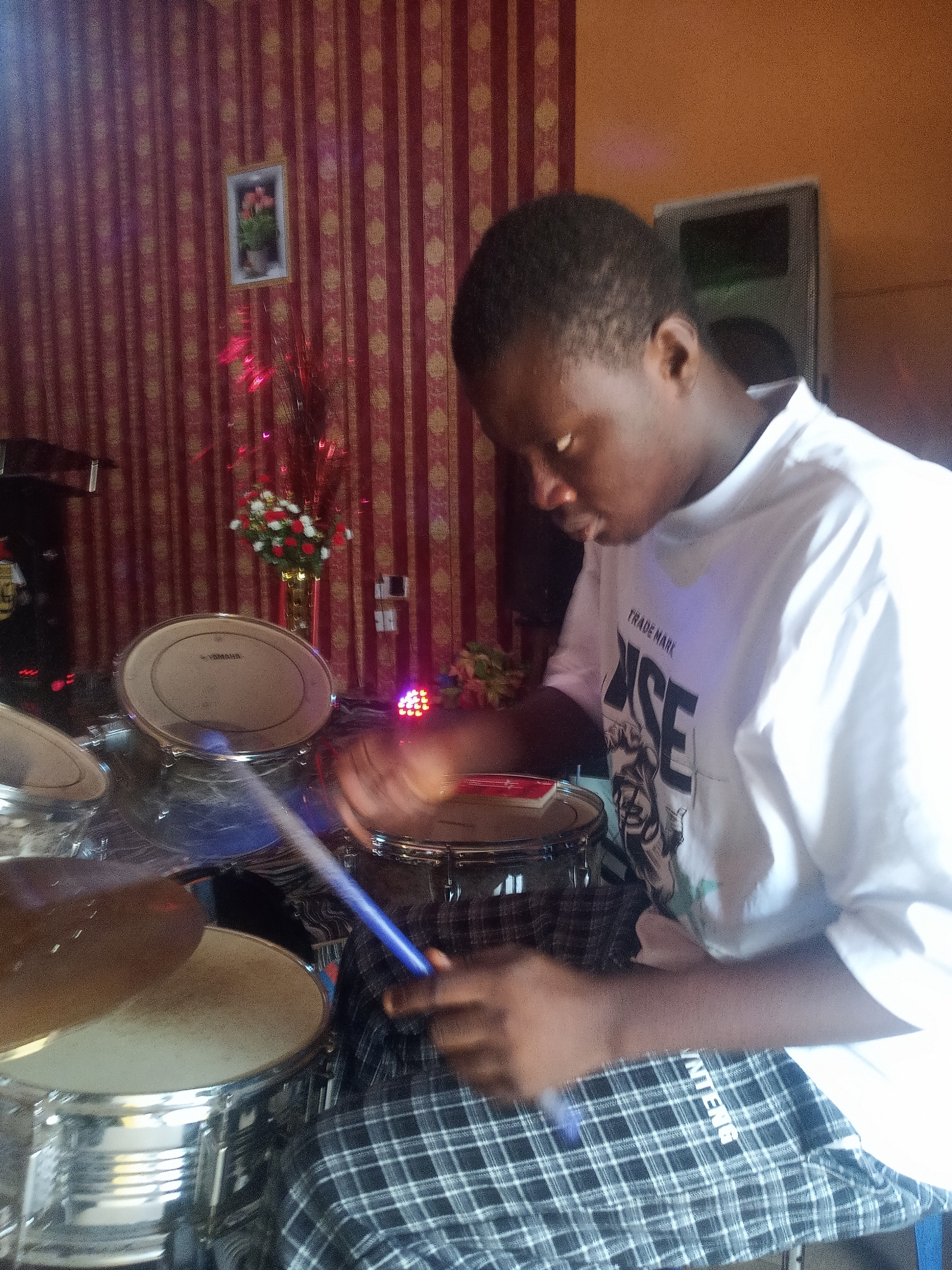 The image shows a person playing a drum set indoors. The person is dark-skinned and wearing a white t-shirt with a graphic print and plaid pants. They are holding a drumstick in their right hand and s…read more