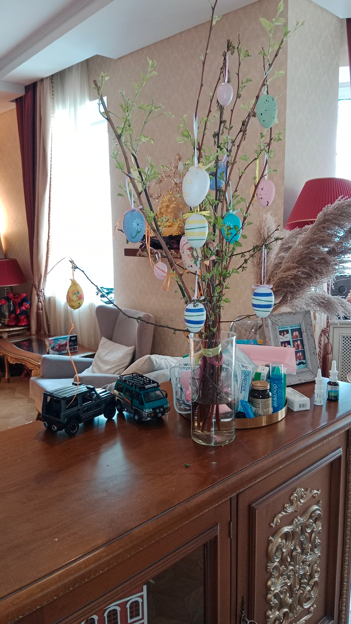 The image captures an interior scene likely within a home or apartment, identifiable by the presence of typical domestic furniture and decorations. The focal point of the scene is a dark wood cabinet…read more