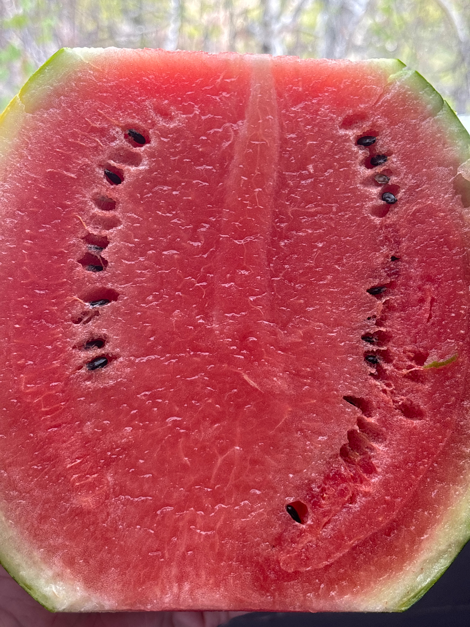 A close-up image shows a cut watermelon. The watermelon flesh is a vibrant red color with scattered black seeds. The rind is visible along the top edge, showing a light green fading into a darker greeβ¦read more