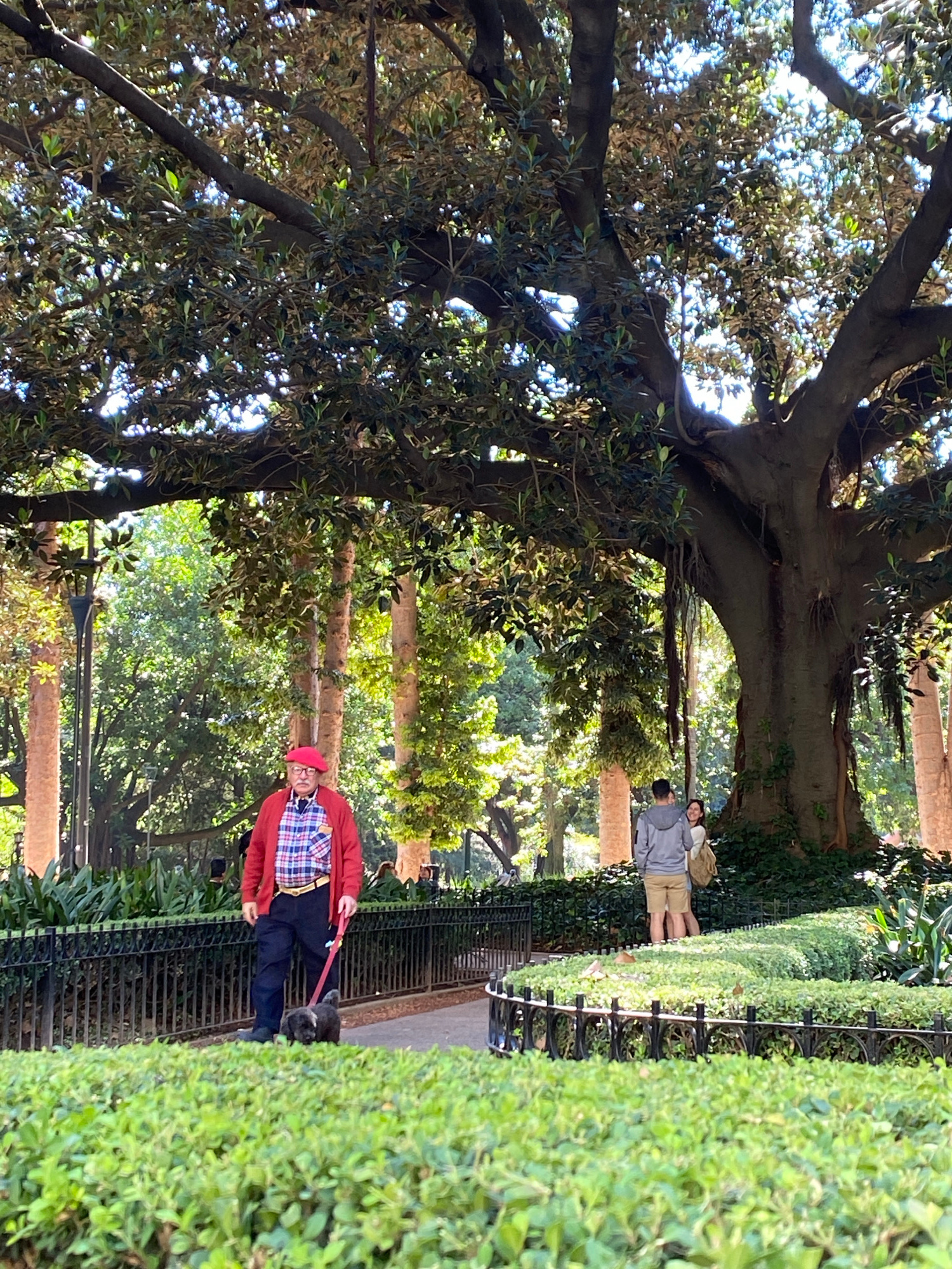 The image depicts a park scene in Buenos Aires, Argentina. The frame is dominated by a large, mature tree on the left, its canopy shading the area. The tree's exposed roots are visible. A man, wearinβ¦read more