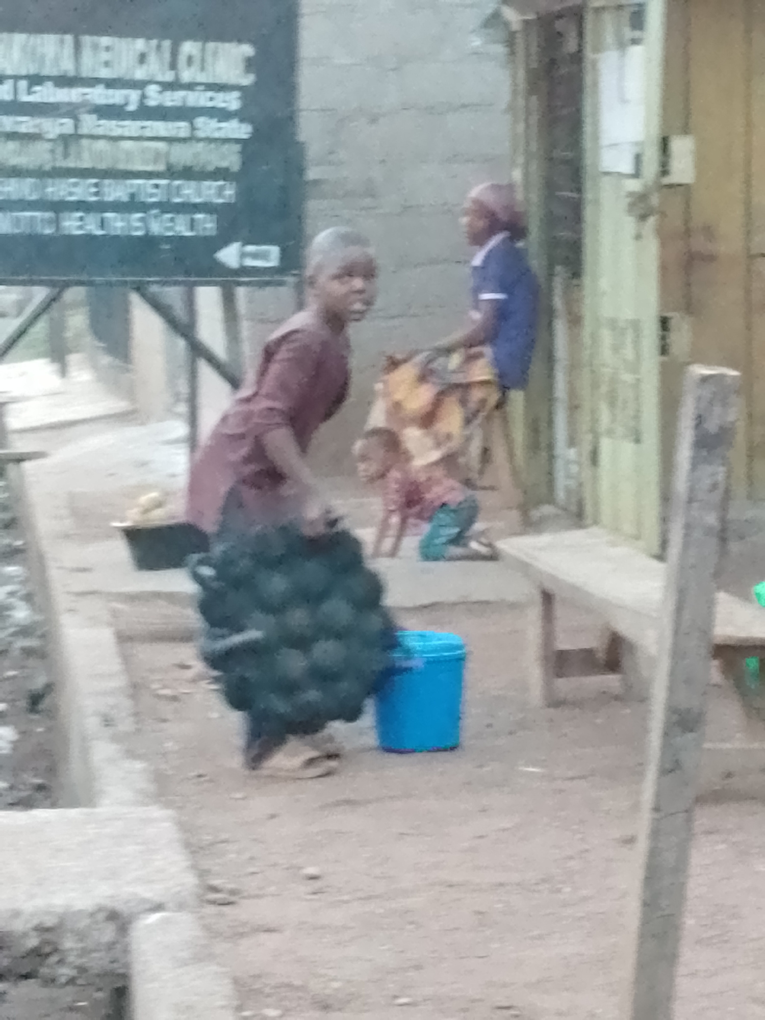 The image shows a street scene in Akwanga, Nigeria, as identified by the sign reading "AKWANA MEDICAL CLINIC" and "KWARANYA NASARAWA STATE." A child is carrying a large, heavy object made of black cir…read more
