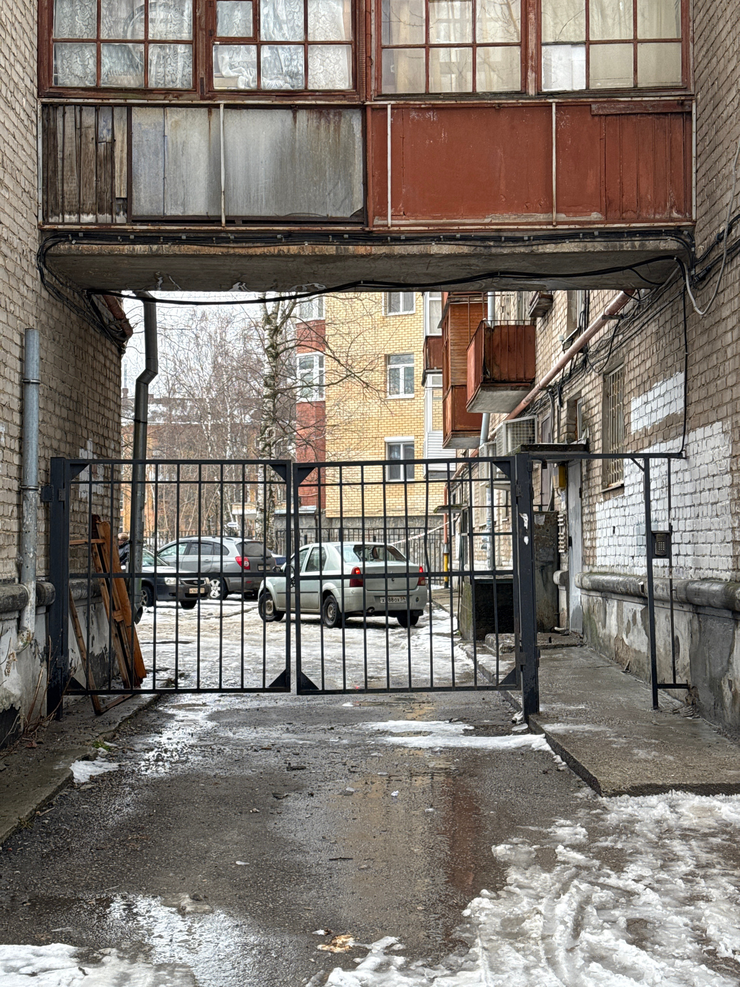 The image captures an urban scene in Perm, Russia, showcasing the architecture and streetscape of the city. The view is from an elevated position, looking down into a narrow courtyard or alleyway betw…read more
