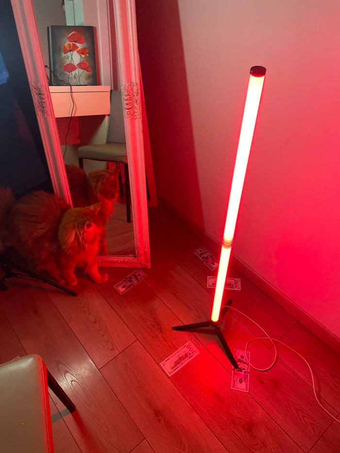 The scene depicts an interior room in Batumi, Georgia, illuminated predominantly by a red light source. A long-haired orange cat stands on a light-colored wooden floor, facing a large, ornate white-fr…read more