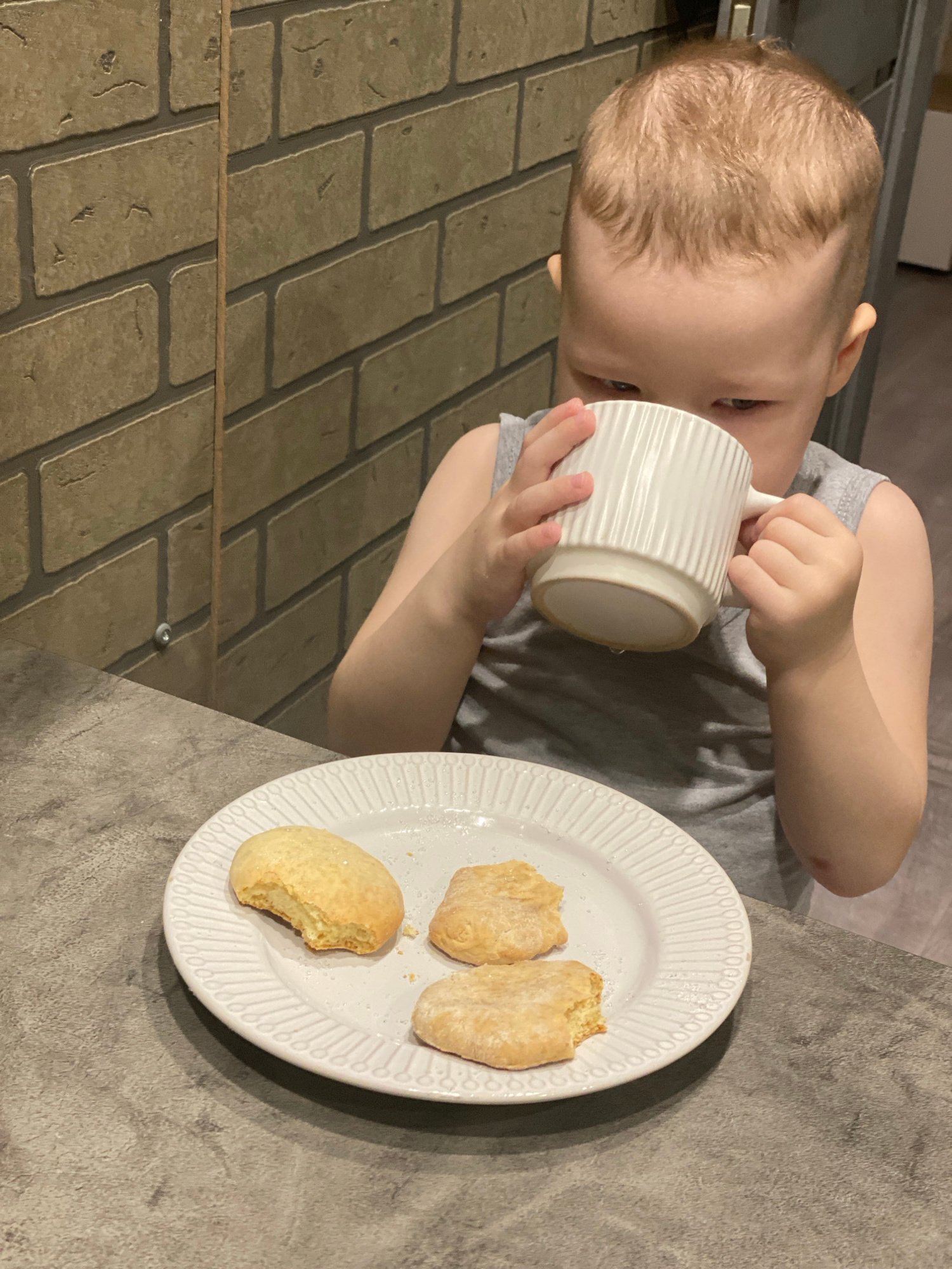 A young child with light blond hair is drinking from a white, ribbed mug while seated at a table. A white plate with three baked goods, one with a bite taken out of it, is on the table next to the chi…read more