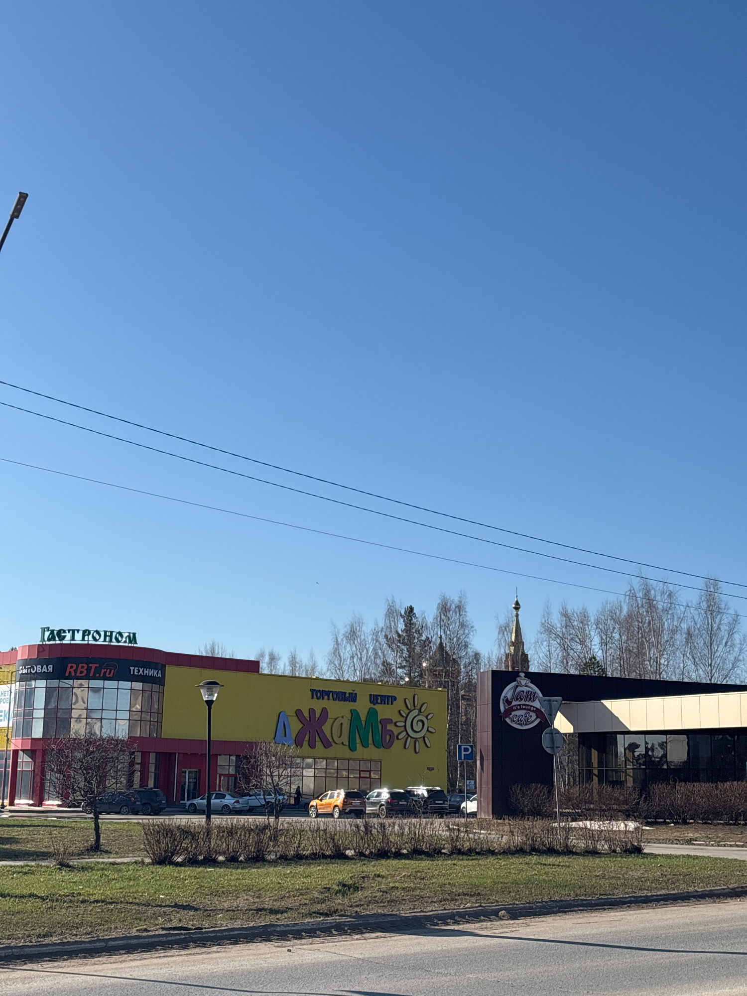 The image displays a street scene on a clear, bright day, rotated 90 degrees clockwise. When viewed upright, the upper portion is dominated by a vast, cloudless blue sky, crossed by several utility li…read more