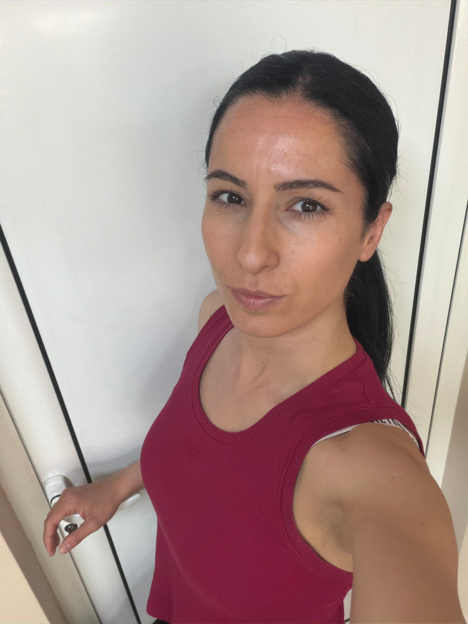 An indoor, waist-up portrait shows a woman taking a selfie, rotated 90 degrees counter-clockwise. The woman has dark hair pulled back, revealing her forehead and ears, and dark eyes looking directly a…read more