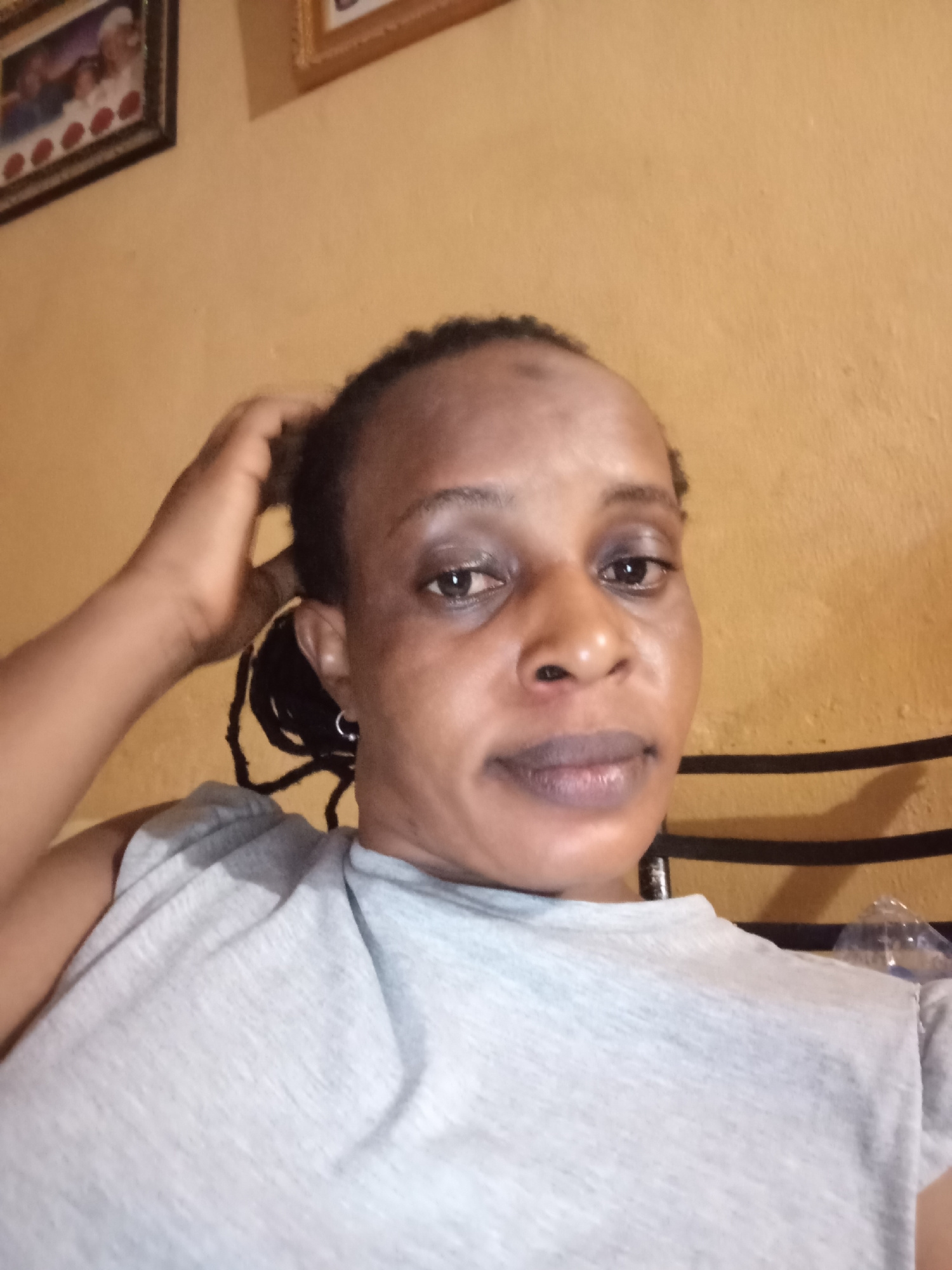 A woman is pictured in an indoor setting. She is fair-skinned, dark-haired, and appears to be touching her hair with her left hand. She wears a light grey t-shirt. Behind her is a yellow wall with fra…read more