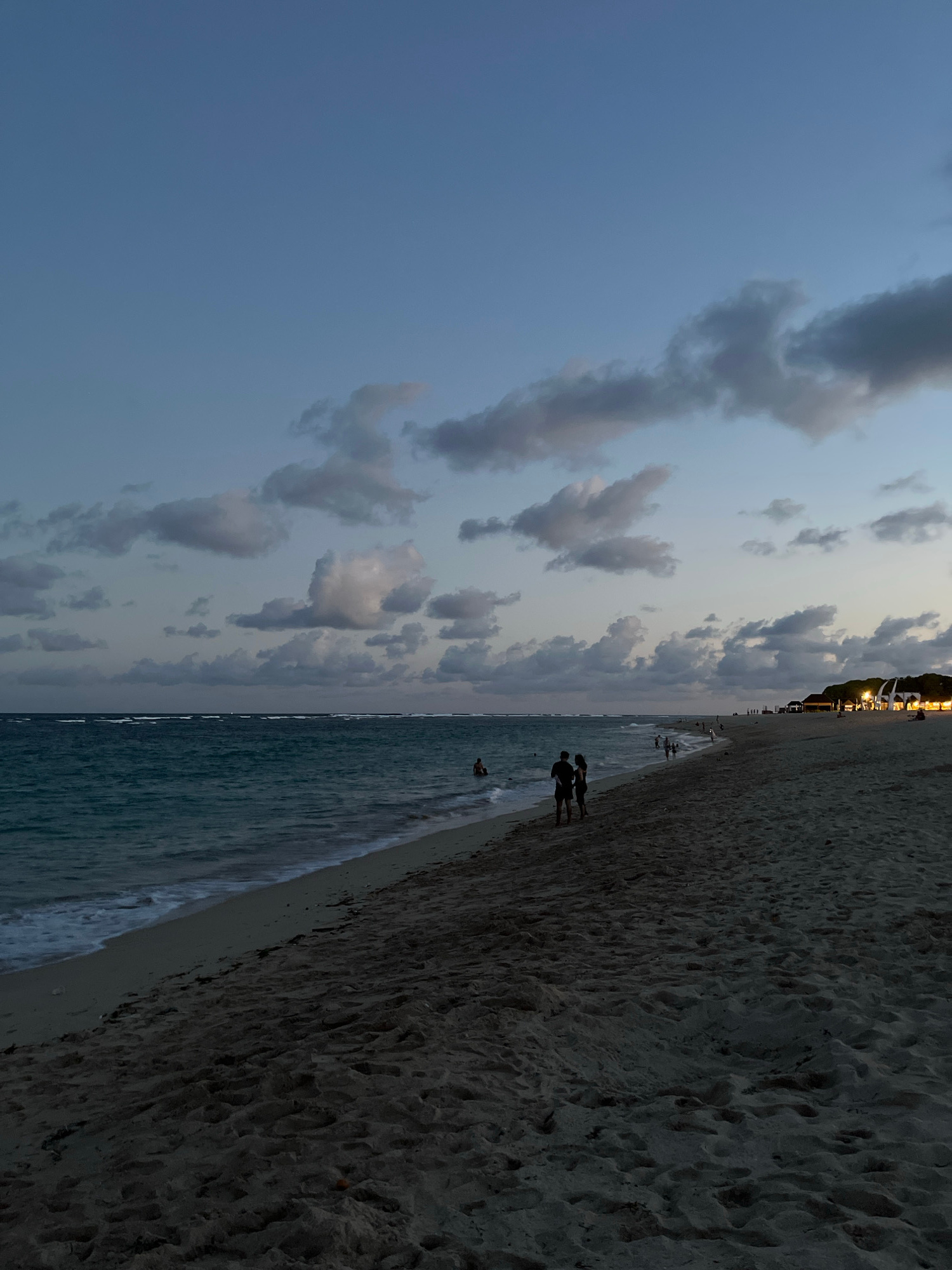 The image captures a beach scene at dusk in Kuta Selatan, Indonesia. The sky, predominantly blue, is dotted with numerous small, puffy gray and white clouds. The beach is sandy and dark, extending alo…read more