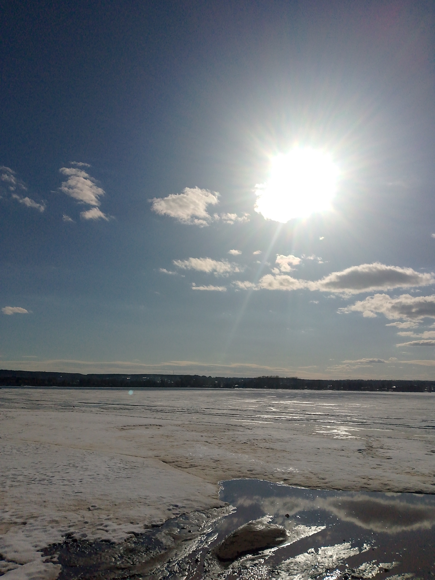 The image depicts a wintry scene in Votkinsk, Russia. A partially frozen body of water, likely the Votkinsk Reservoir or Kama River, dominates the foreground, with patches of snow and ice intermixed w…read more