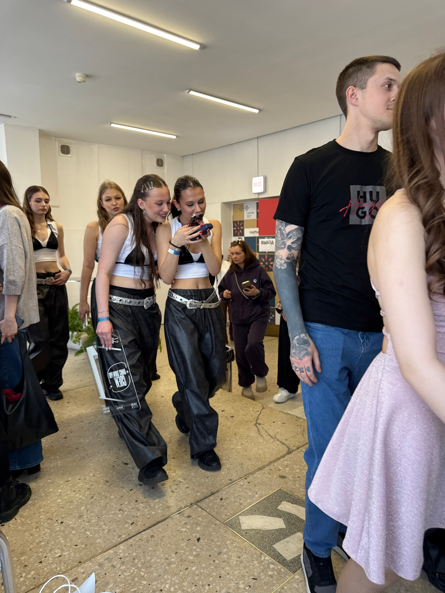 The image captures an interior scene in the city of Perm, Russia. It appears to be a gathering of young people. The people are standing, taking pictures with phones, and interacting with each other. T…read more