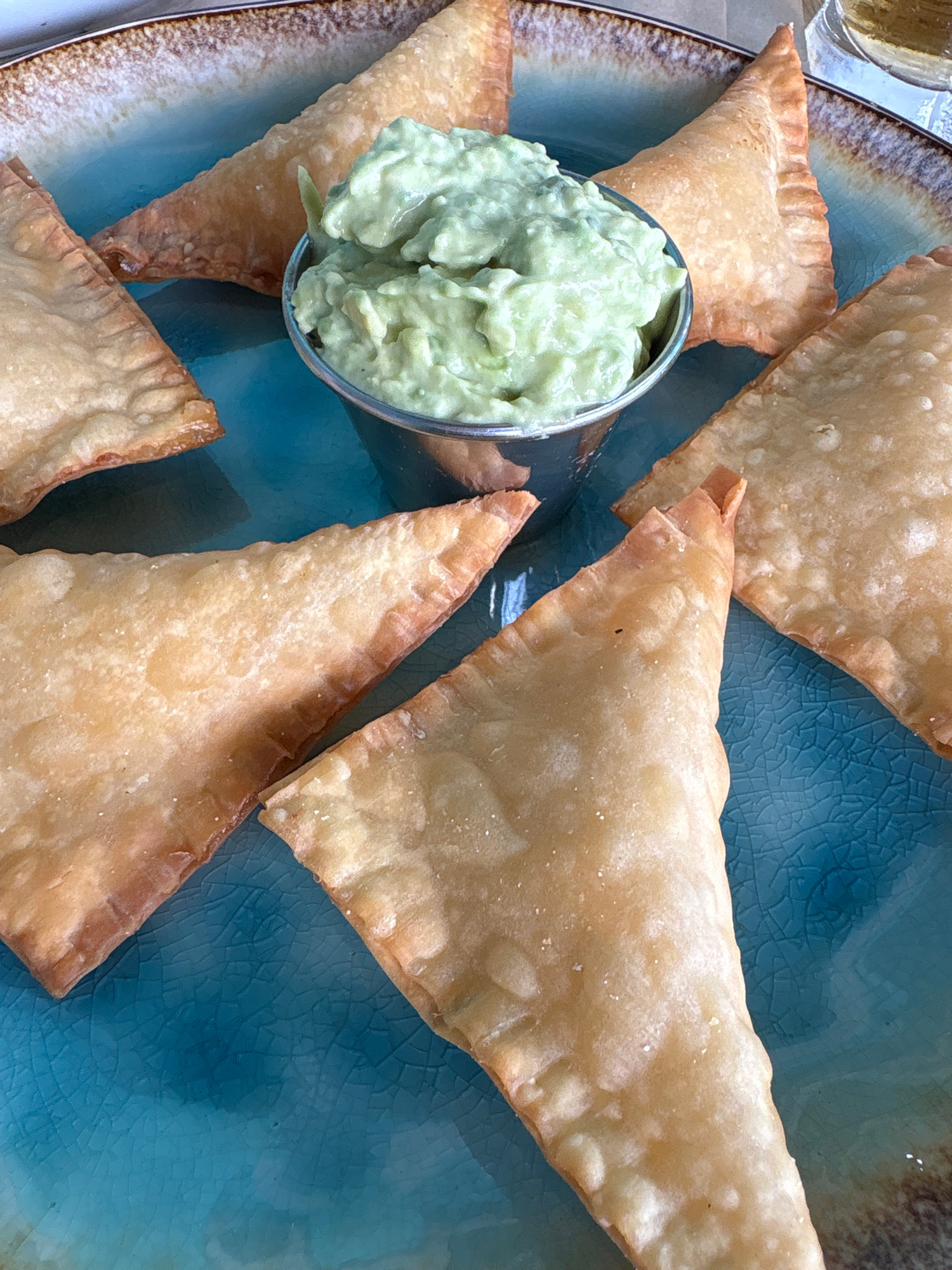 A top-down view presents a textured blue plate featuring several fried empanadas arranged around a small metal cup filled with a green, chunky dip. The empanadas are golden-brown with crimped edges. T…read more