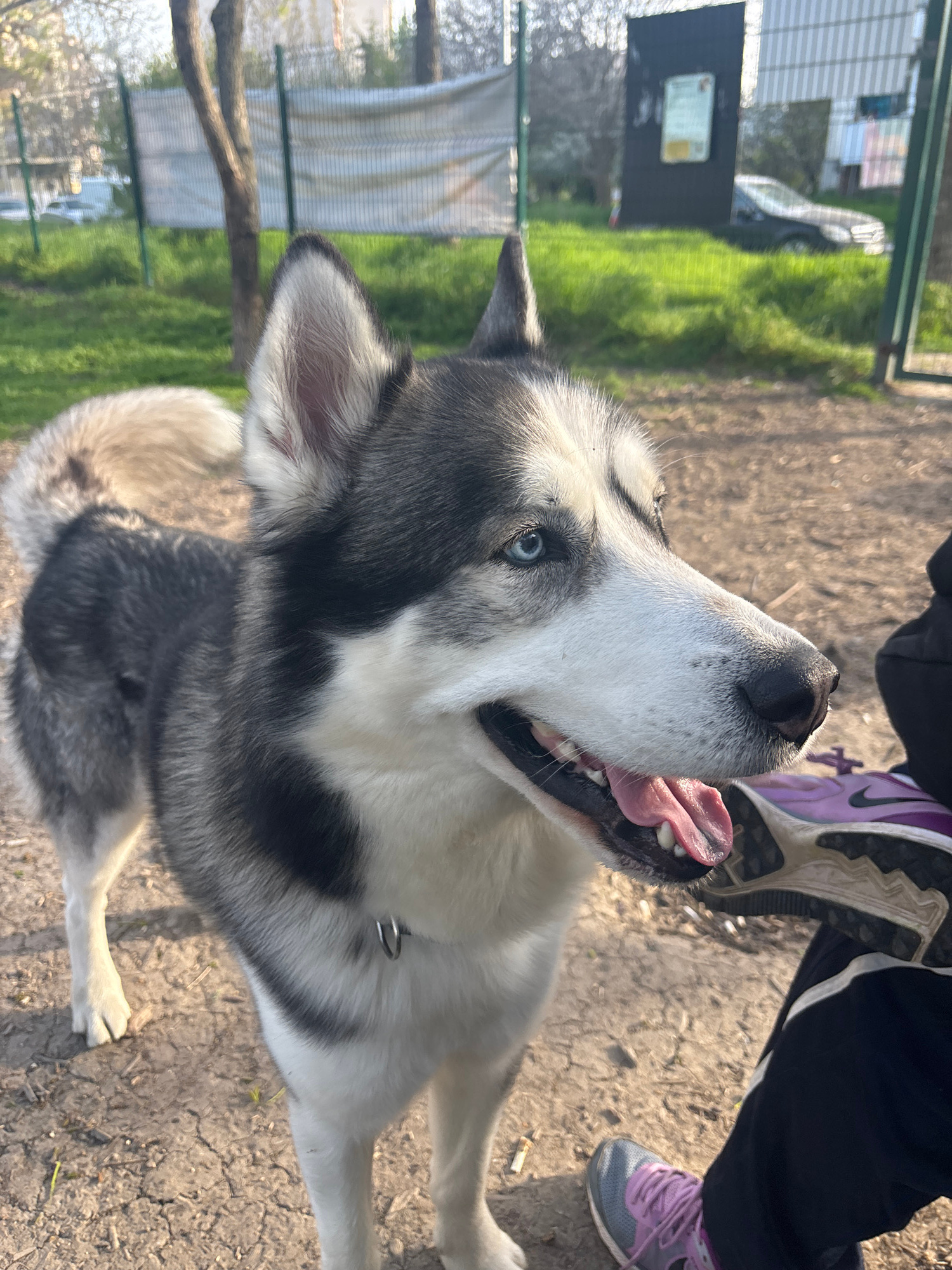 A close-up shot captures a Husky dog outdoors, panting with its tongue out. The dog has a white and gray coat and blue eyes. A person wearing athletic shoes and dark pants is standing nearby. The grou…read more