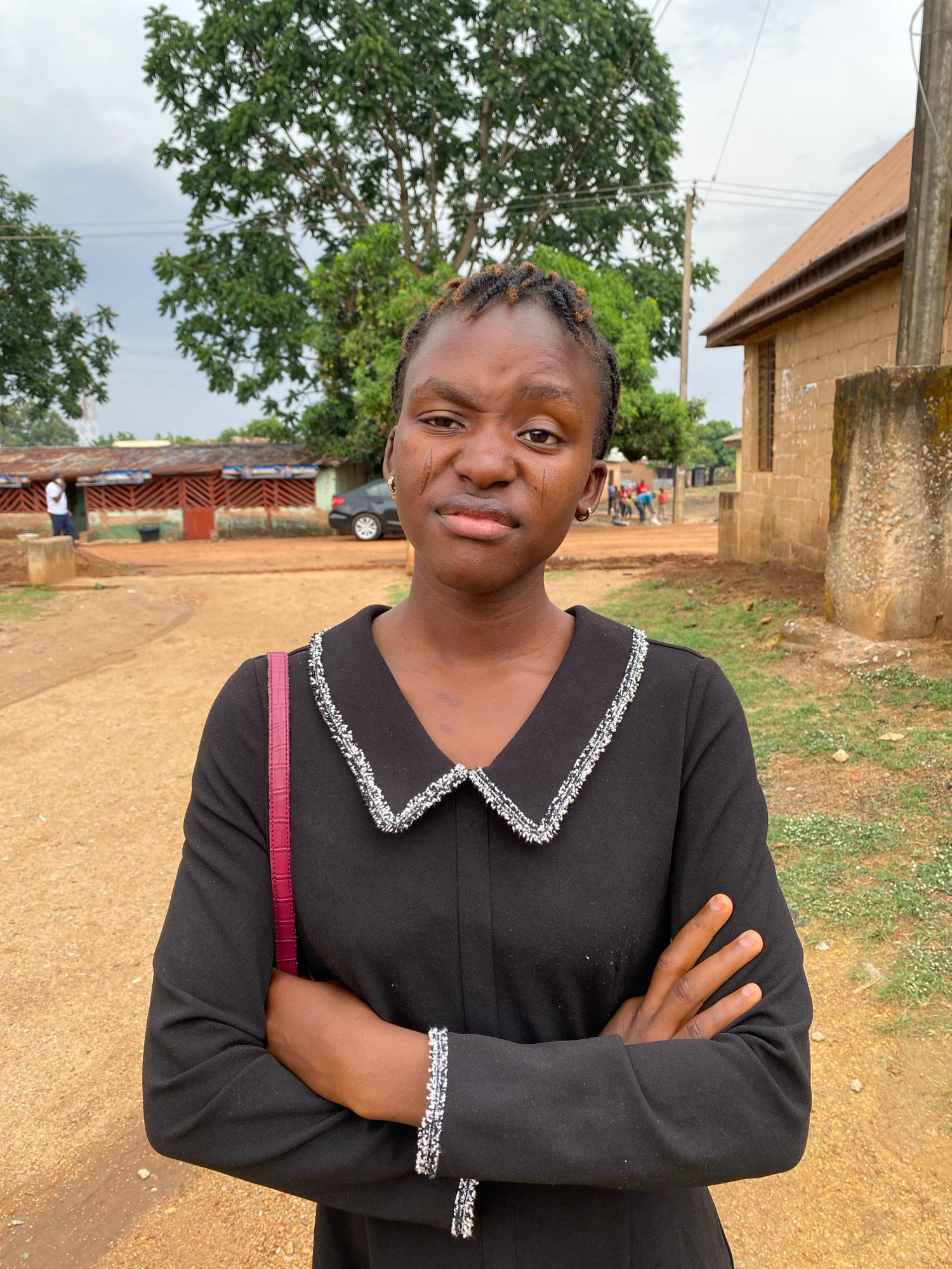 A young woman with braided hair stands outdoors in Kuru Dungus, Nigeria. She is wearing a black jacket with silver trim on the collar and cuffs. Her arms are crossed. A red strap is visible over her s…read more