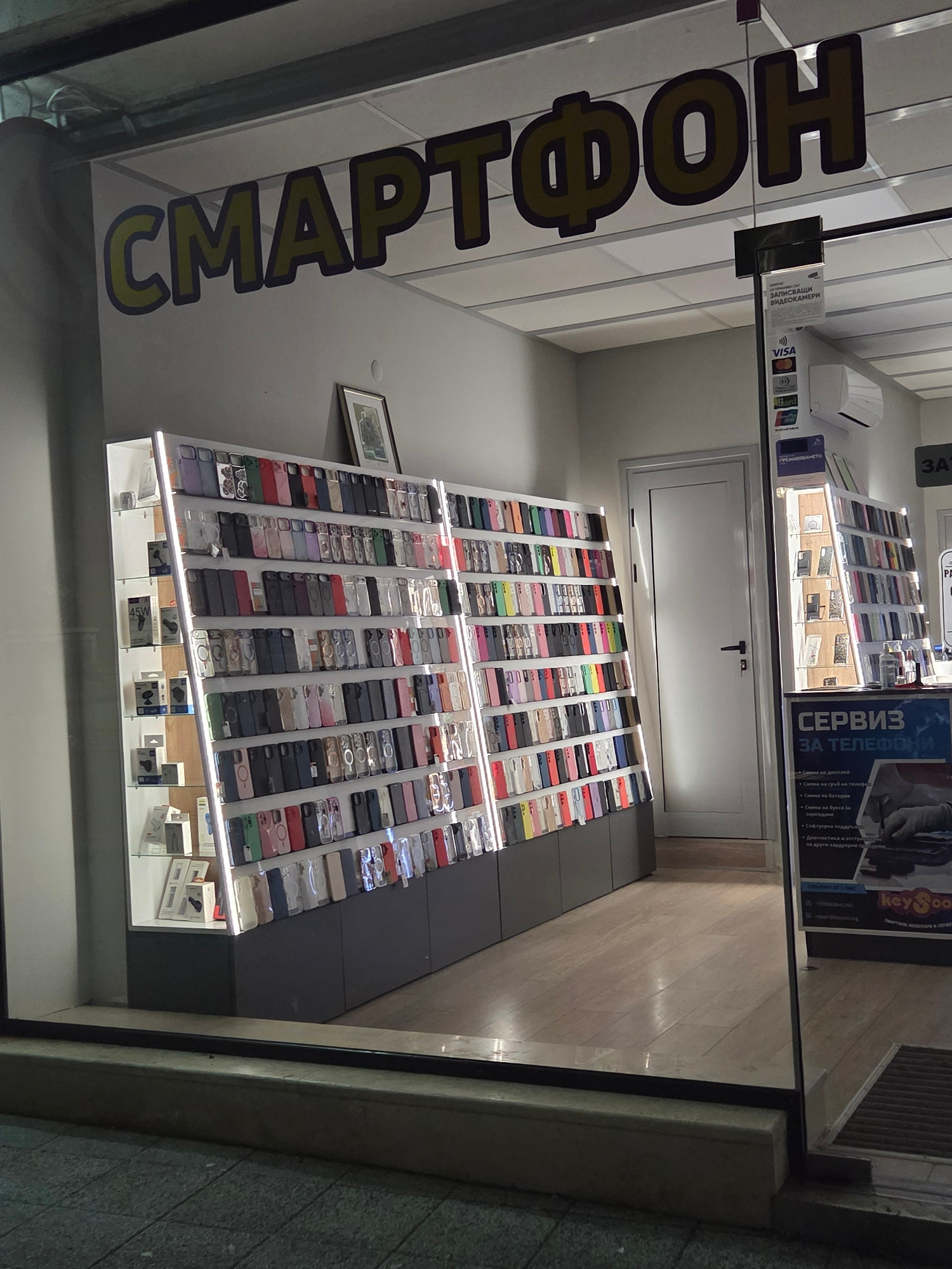 The image provides a view into a brightly lit mobile phone and electronics accessories shop in Pleven, Bulgaria, seen through a glass storefront. No people are visible. The shop's interior features a…read more