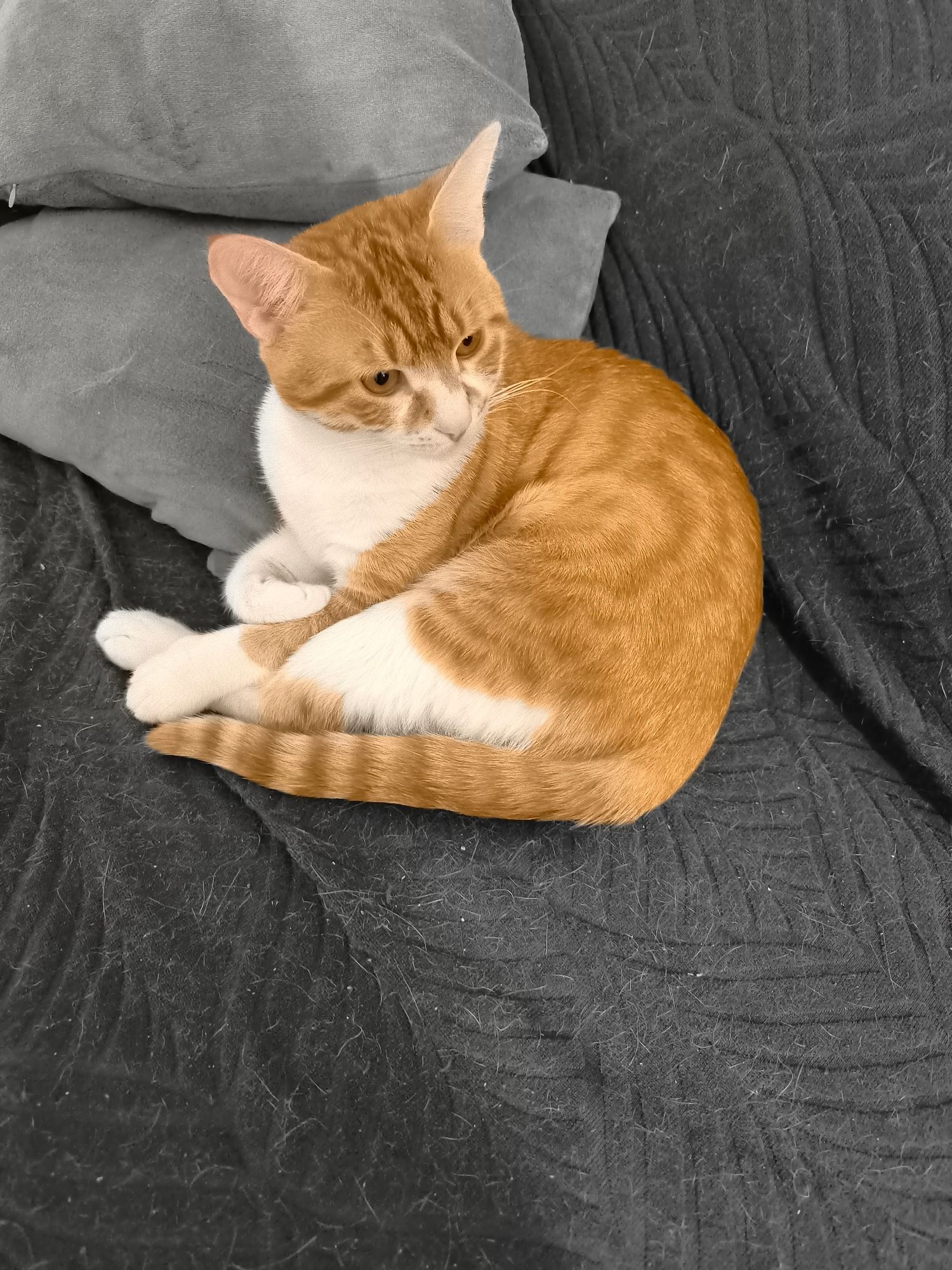 A medium-shot depicts an orange and white cat curled up on a dark gray textured sofa in front of two gray pillows. The cat is facing left, with its paws crossed and tail curled around its body. The ba…read more