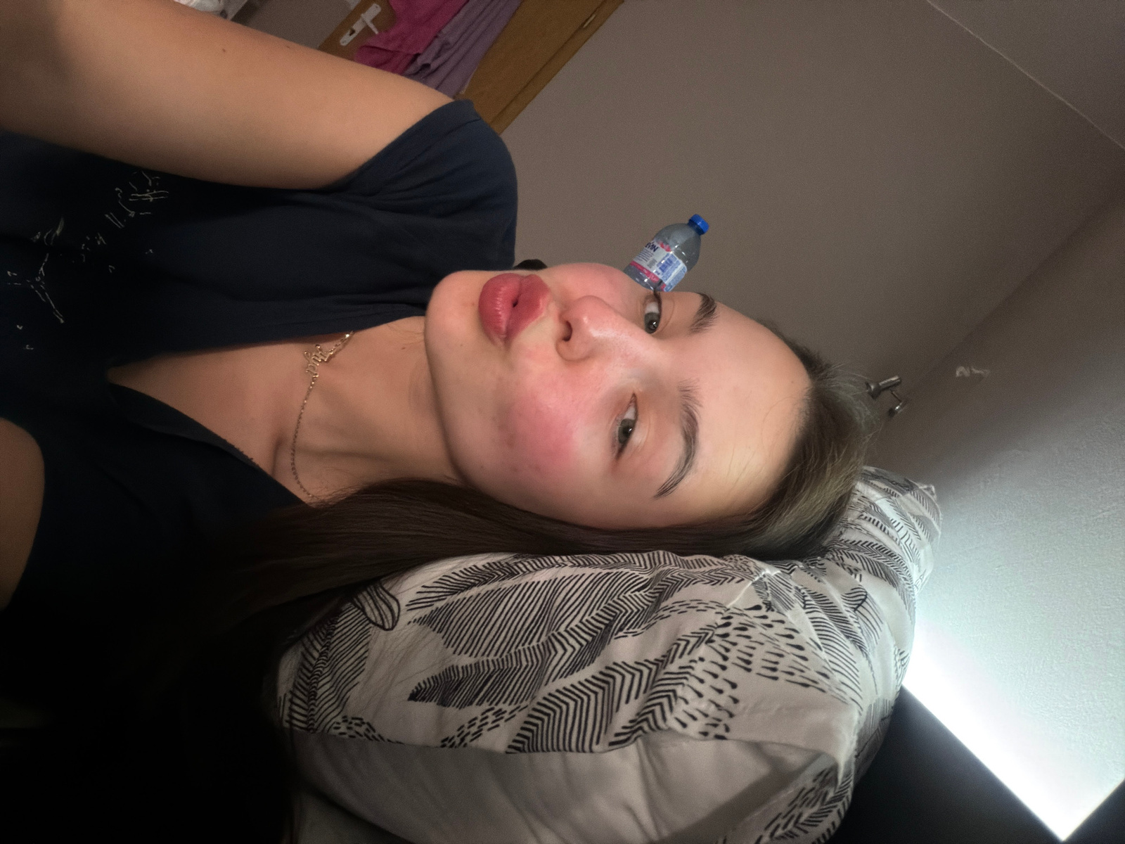 A young woman is photographed in an indoor setting, likely a bedroom, given the pillow behind her head. She has fair skin, dark hair, and is wearing a dark-colored t-shirt. A small water bottle is pos…read more
