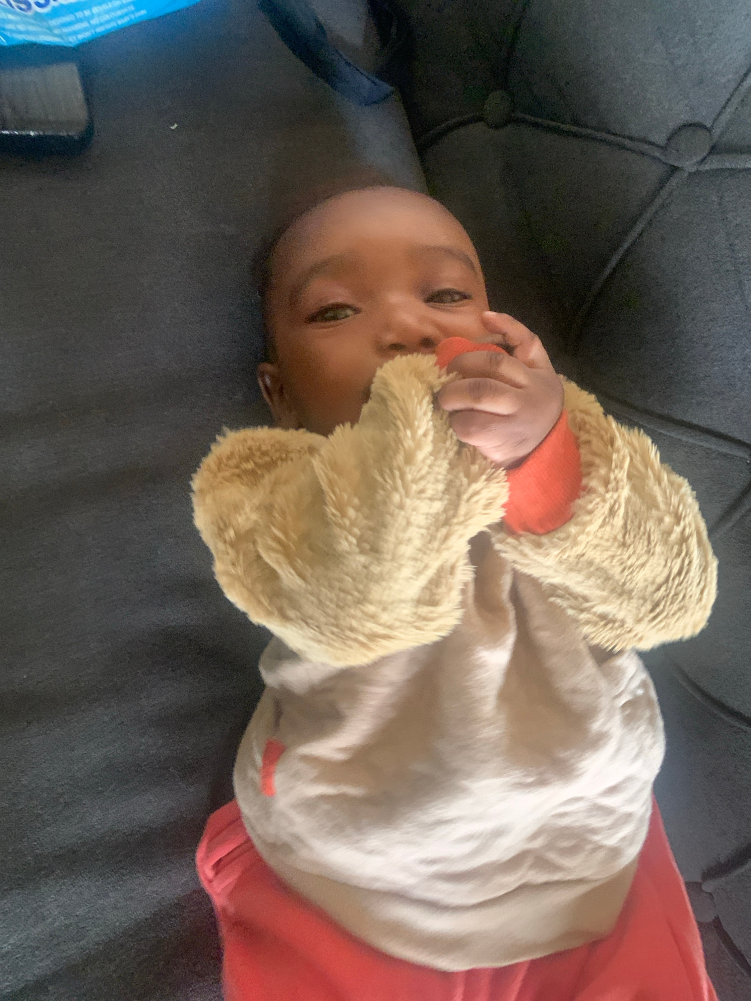 An infant is lying on a gray upholstered sofa. The infant is wearing a beige fuzzy jacket with orange cuffs over a white top and pink pants. The infant is holding their hand to their mouth. A portion…read more