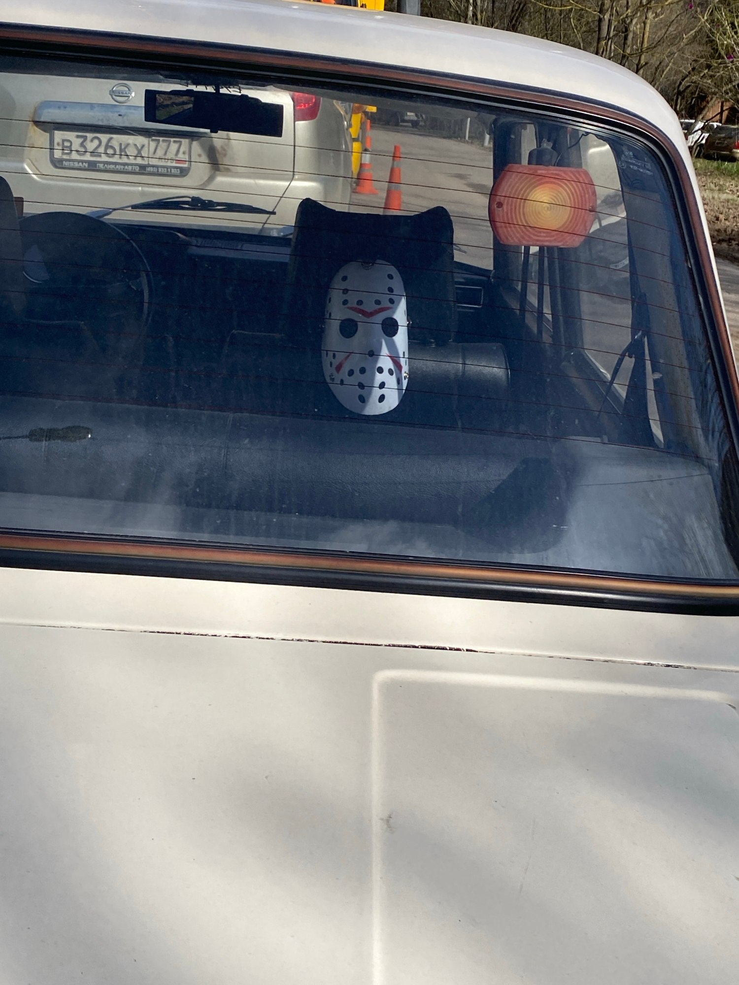The image captures the rear window and a portion of the white body of a vehicle, likely a van or SUV, under bright daylight. The view is from outside, looking into the vehicle's interior through its r…read more