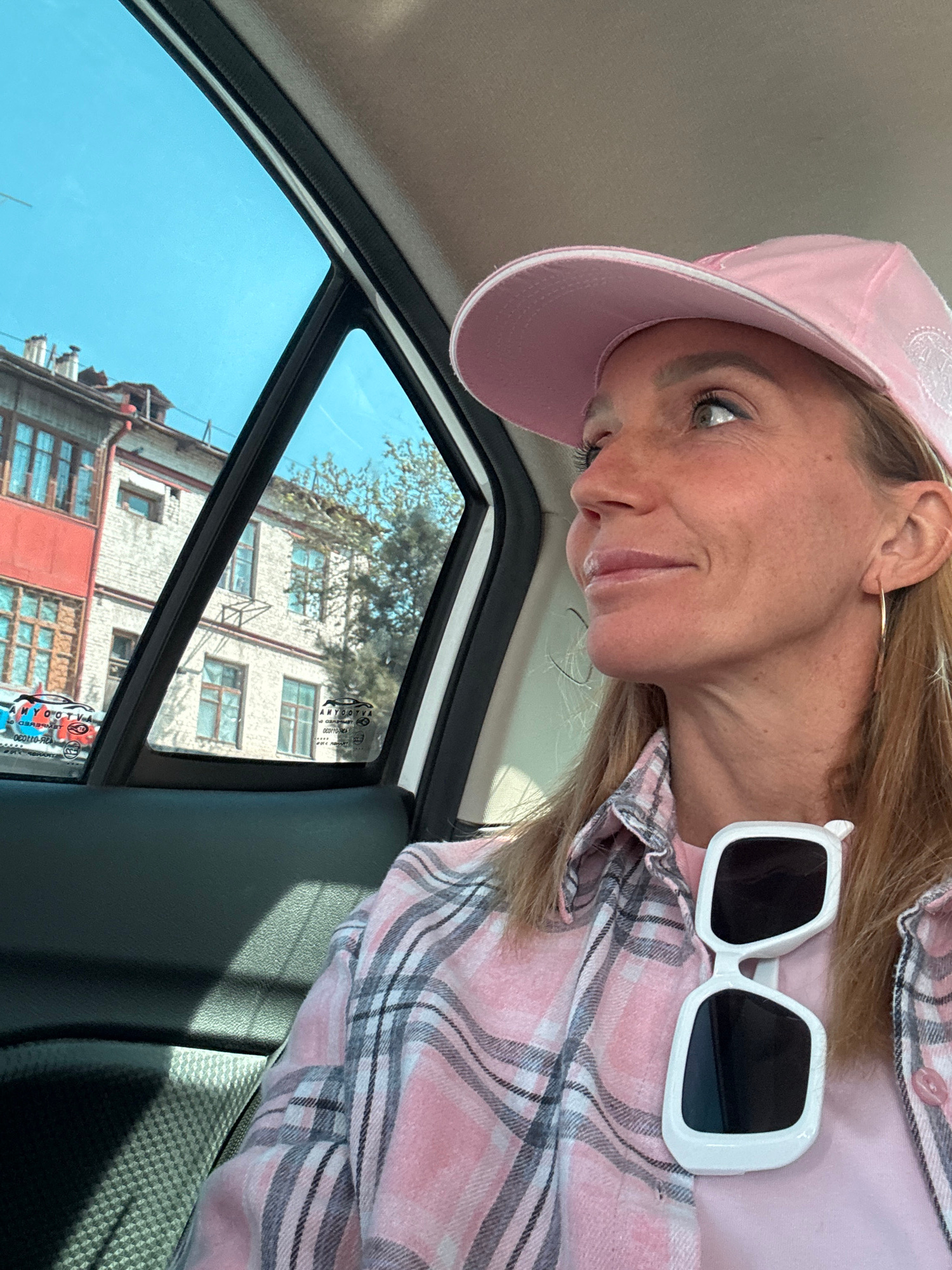 A medium shot shows a woman wearing a pink baseball cap and pink plaid shirt in what appears to be a vehicle. She is looking down and slightly towards the camera. A pair of white, square sunglasses ar…read more