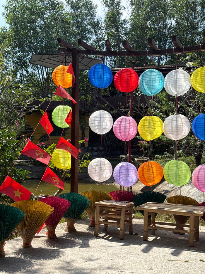 A vibrant display of colorful lanterns hangs from a wooden structure amidst lush greenery. Red flags with gold stars flutter below. Beside the lanterns, small wooden tables and chairs rest on a concre…read more