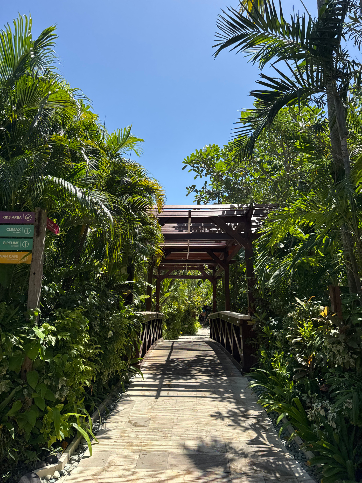 The image shows a pathway in Kuta, Indonesia, surrounded by lush tropical vegetation, including palm trees. A wooden structure, possibly a platform or small building, is visible amidst the foliage. Si…read more