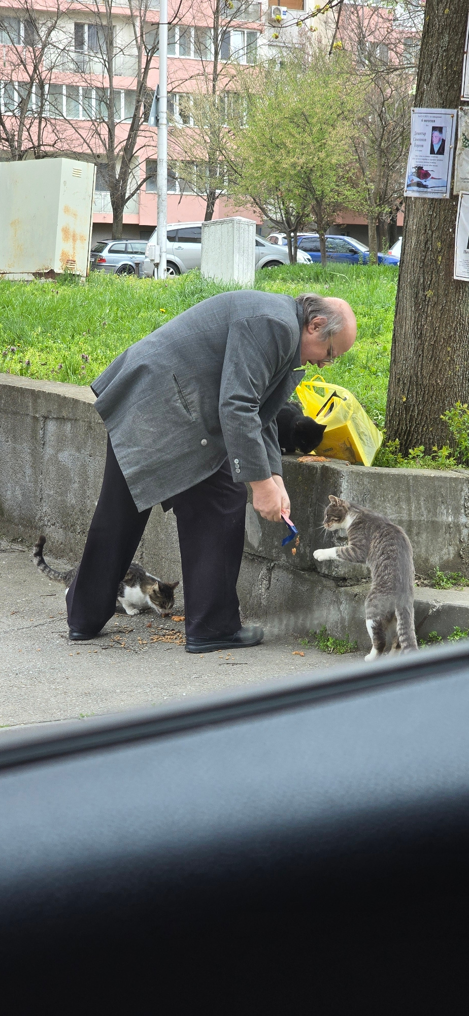 An older man in a gray suit is squatting down to feed several cats in a city environment, presumably Veliko Tarnovo, Bulgaria. He is holding a blue and pink object, possibly a container or tool for di…read more