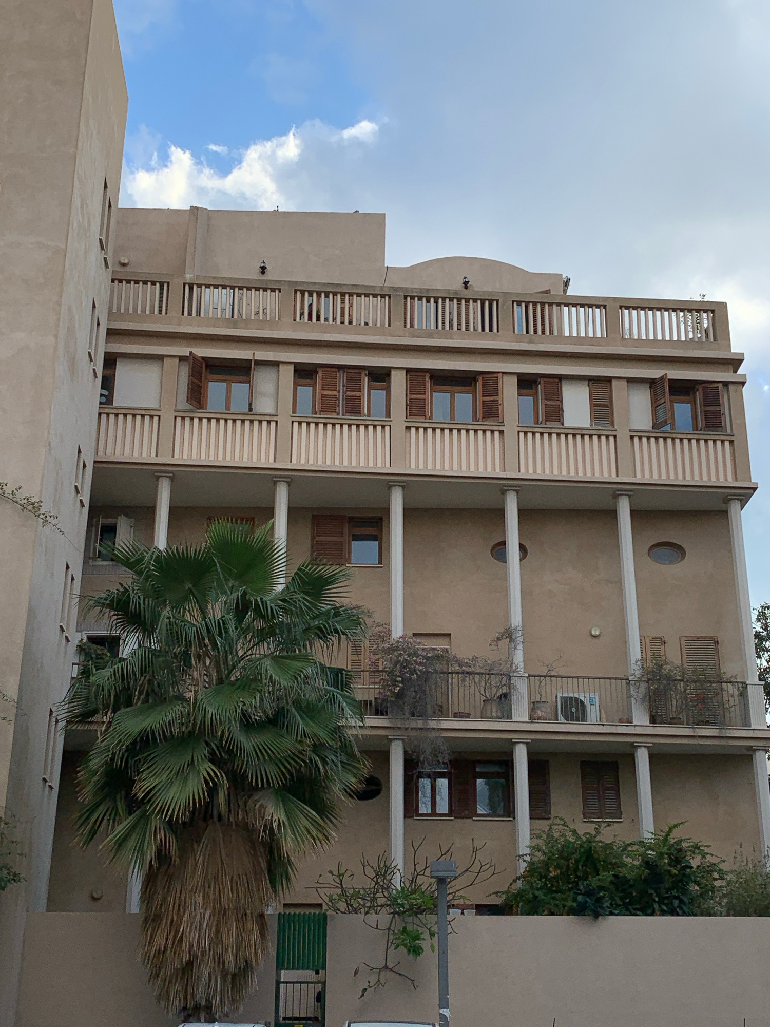 A daytime shot of a multi-story residential building in Tel-Aviv, Israel, is viewed from a low angle. The building is painted in a beige hue, incorporating both traditional and modernist architectural…read more