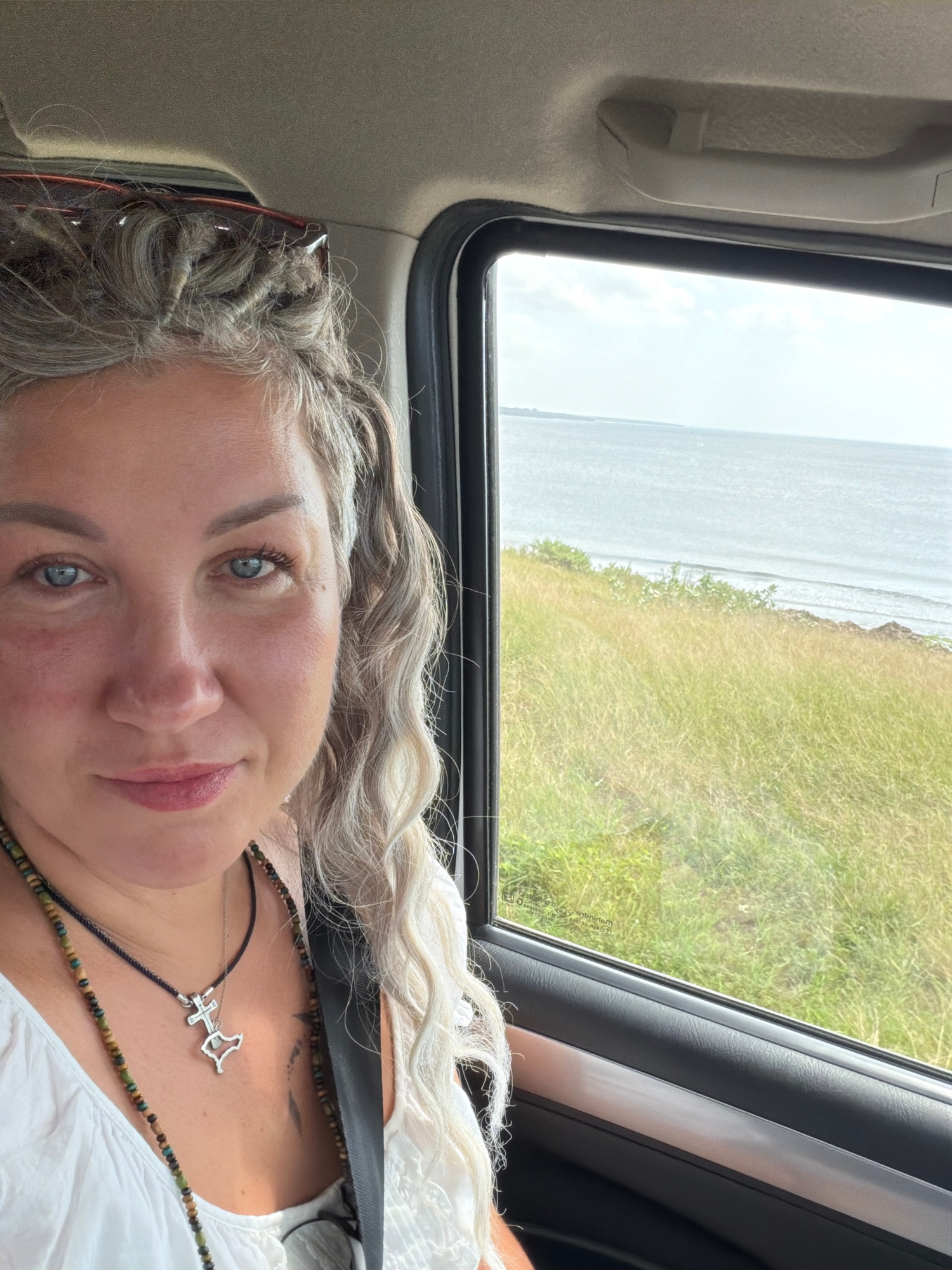 A rotated close-up shot shows a woman inside a vehicle, looking towards the camera with a gentle smile. She has light, wavy hair, blue eyes, and is wearing a white top. Multiple necklaces adorn her ne…read more