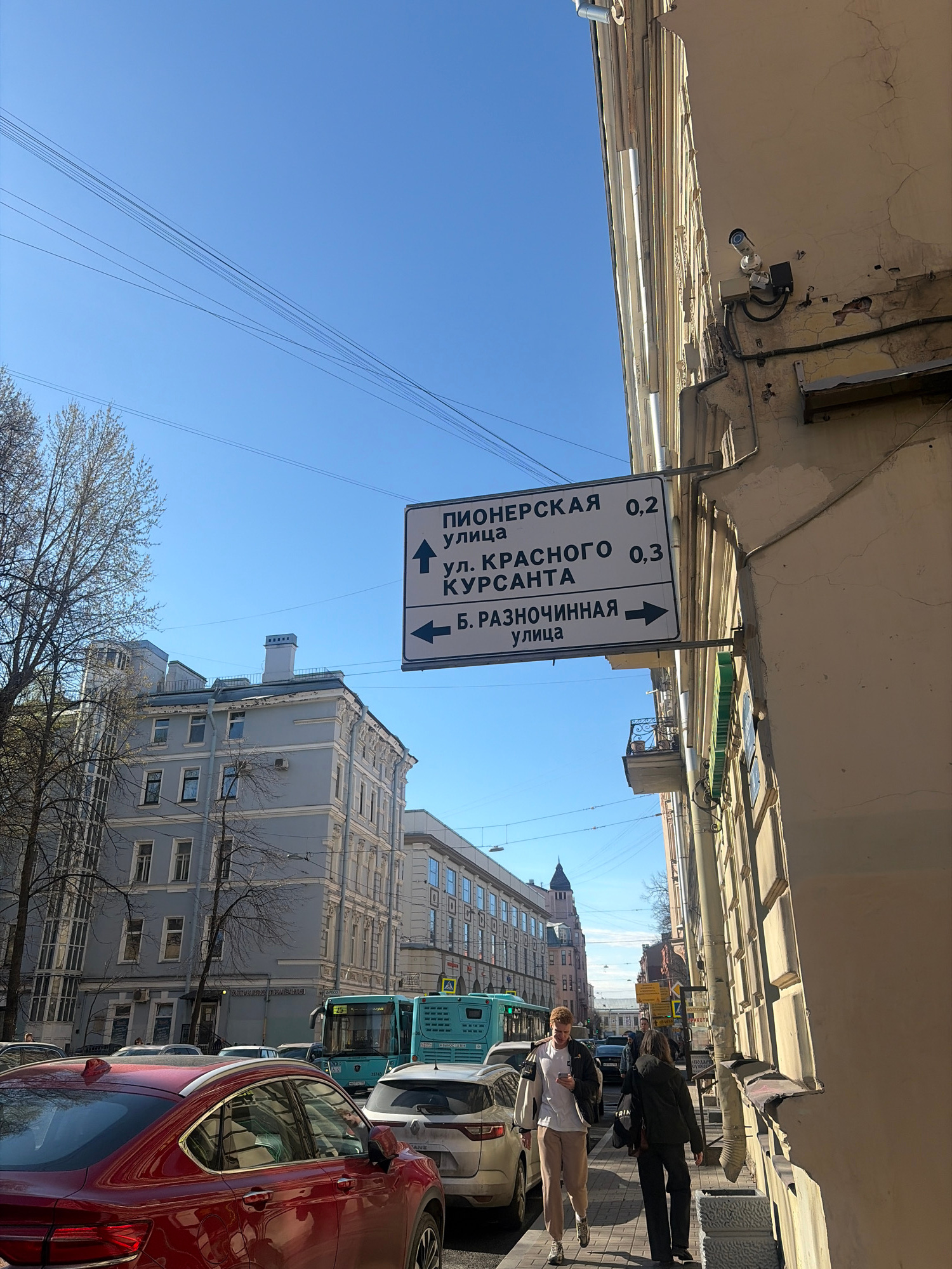 An eye-level shot captures a sunny urban street scene in Saint Petersburg, Russia, looking down a street lined with buildings and vehicles. The sky is a clear, bright blue, crisscrossed by multiple ut…read more