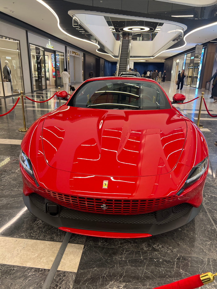 A bright red Ferrari sportscar, identified as a Roma or similar model, is centrally displayed on a polished dark marble floor within a modern shopping mall, identified as Tashkent City Mall in Tashken…read more